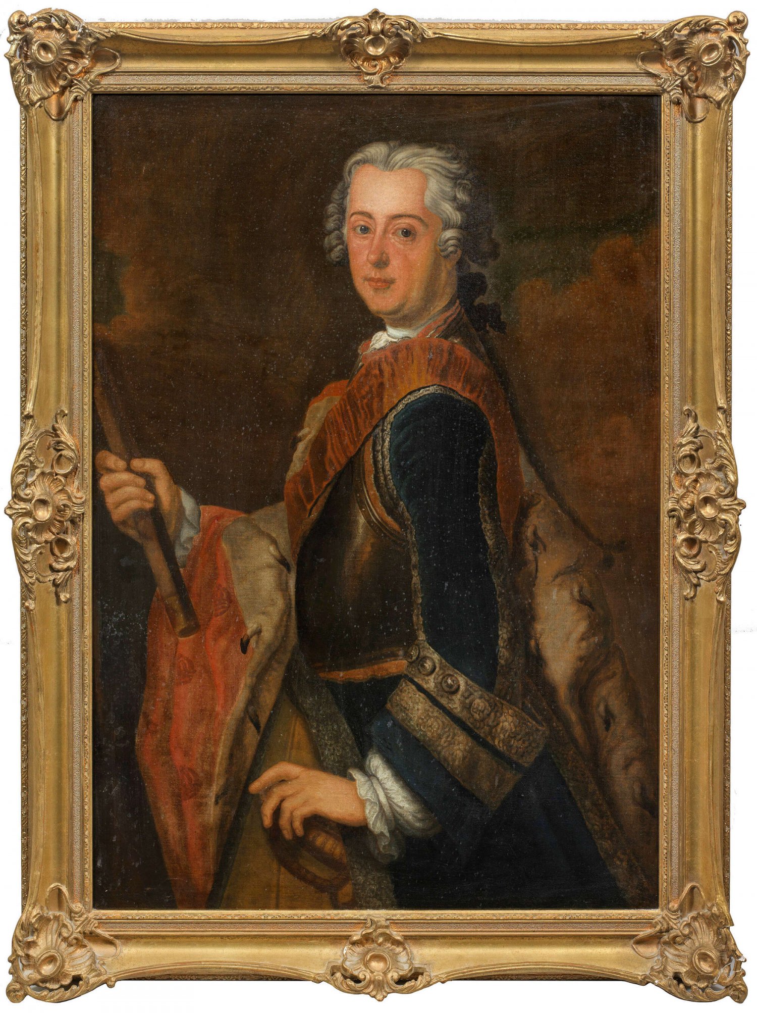 Das Repräsentationsporträt stellt den König in selbstbewusster Pose in einem Brustharnisch und silberbetresster, dunkelblauer Uniformjacke mit der orangefarbenen Ordensschärpe des Schwarzen Adlerordens und umgelegtem Hermelinmantel dar, mit der rechten Hand einen Kommando- bzw. Marschallstab haltend, die linke Hand an den Griff eines Degens gelegt. Die Malerin schildert den König und Heerführer unmittelbar nach dem für ihn erfolgreichen Ersten Schlesischen Krieg (1740-1742). Hierbei musste sie in ihrer Komposition auf einen früheren Bildtypus des Hofmalers Antoine Pesne zurückgreifen, da der König seit 1740 nicht mehr Modell saß. Von Louise Gertrud Mitthoffen (Mithoff), die offenbar aus der bekannten hannoverschen Familie stammte, war bisher nur ein Stich nach einem Gemälde in der Porträtsammlung der Herzog August Bibliothek Wolfenbüttel bekannt. Öl/Lwd.; Verso sign. u. dat. "Louise Gerdrut. Mithoffen. (/) geb. Bornemann. (/) pinxit. 1743". 108 cm x 78 cm. Rahmen.