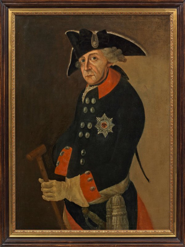 Annähernd lebensgroßes, repräsentatives Hüftbildnis des Monarchen in Uniform, mit Dreispitz und Bruststern des Schwarzen Adlerordens, in der linken Hand seinen Gehstock - den sog. "Fritzstock" - haltend. Das ihn ausdrucksvoll charakterisierende Porträt zeigt den König als "Alten Fritz" um 1780. Franke schuf ab 1763/64 zahlreiche Porträts des Königs; neben dem Künstler selbst, der als Hofmaler eine bedeutende Stellung einnahm, fertigte seine Werkstatt auch eine Reihe von Repliken an. Öl/Lwd.; 87,5 cm x 66,5 cm. Rahmen.