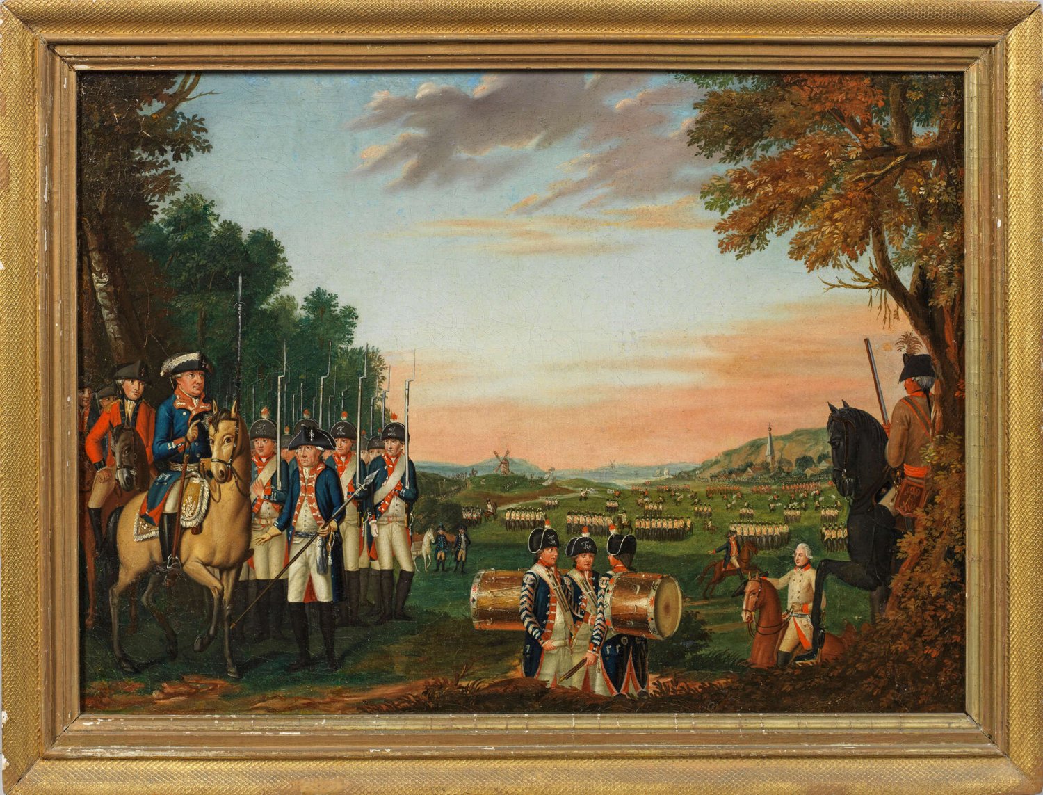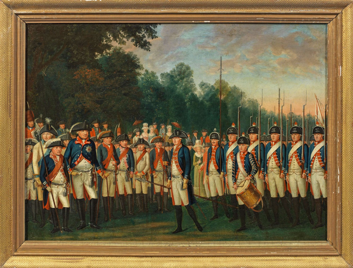 Gegenstücke. In fein lasierender Malerei ausgeführte, vielfigurige, detailreiche Szenen im Morgenrot mit duftig bewölktem, atmosphärisch gestimmtem Himmel. Das eine Gemälde zeigt eine sog. "Königsparade", bei welcher der seit 1786 regierende König Friedrich Wilhelm II. von Preußen (1744 - 1797) den Vorbeimarsch des Regiments selbst abnimmt; ihm zur Seite steht als Regimentschef General Herzog Friedrich August von Braunschweig-Lüneburg (1740 - 1805), als zweiter und dritter rechts vom König der Kronprinz Friedrich Wilhelm III. von Preußen (1770 - 1840) und sein jüngerer Bruder Prinz Friedrich Ludwig Karl "Louis" von Preußen (1773 - 1796). Das andere Gemälde stellt König Friedrich Wilhelm II. zu Pferde dar, hinter ihm ein ebenfalls berittener englischer Gast, dem der Herzog ein Manöver des Regiments in weiter Landschaft vorführt. Militärhistorisch bedeutend ist, dass im Unterschied zu den Offizieren die Unteroffiziere, einfachen Soldaten und Tambours auf beiden Gemälden den 1787 in der preußischen Armee eingeführten, praktischen "Kaskett" tragen: ein kleiner, quer getragener Zweispitz aus Filz, dessen Vorderkrempe das königliche Monogr. "FW" zeigt und dessen Hinterkrempe bei Regen als Nackenschutz heruntergeschlagen werden konnte. Ikonographisch außergewöhnlich ist auch die auf das Regiment konzentrierte Darstellung, während Daniel Chodowiecki 1777 in seiner Radierung "Wachtparade in Potsdam" noch König Friedrich II. in Zentrum stellte. Aufgrund der Provenienz dürften die Gemälde im Auftrag von Friedrich August von Braunschweig-Lüneburg ausgeführt worden sein, der 1763-1794 Regimentschef war. Friedrich August und Friedrich Wilhelm II. waren Cousins und zugleich Neffen König Friedrich II.; Öl/Lwd., doubl: Verso auf dem Keilrahmen jeweils alter Sammlungs-Stempel mit Ligatur-Monogramm "EA" mit Königskrone für Ernst August III., Prinz von Hannover, Herzog von Braunschweig und Herzog zu Braunschweig und Lüneburg (1887 - 1953). 40 cm x 55,5 cm. Rahmen.