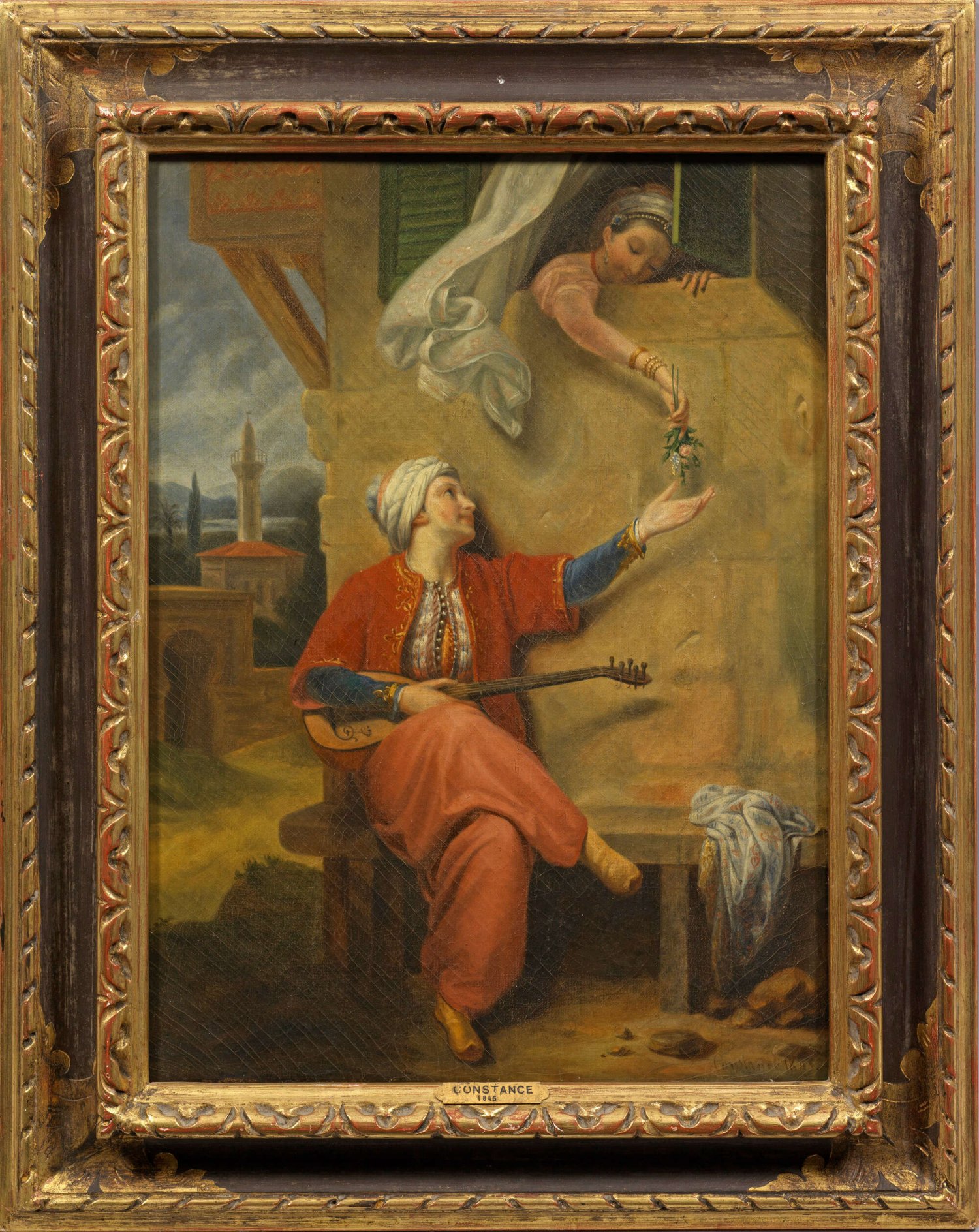 Unterhalb eines geöffneten Fensters auf einer Bank sitzender, junger Mann in orientalischer Tracht, der auf einer Buzuq seiner Geliebten ein Lied vorgetragen hat und nun von dieser einen kleinen Blumenstrauß als Liebesgabe herunter gereicht bekommt. Im Hintergrund Blick auf eine Landschaft mit Minarett und Palme. Spätromantische, feinflüssig gemalte Darstellung, die in poetischer Weise eine orientalische Genreszene mit dem Motiv der durch Hindernisse erschwerten Liebe verknüpft. Öl/Lwd., doubl.; R. u. sign. u. dat. 1845. Am Rahmen montierte alte Plakette. 50,5 cm x 38 cm. Rahmen.