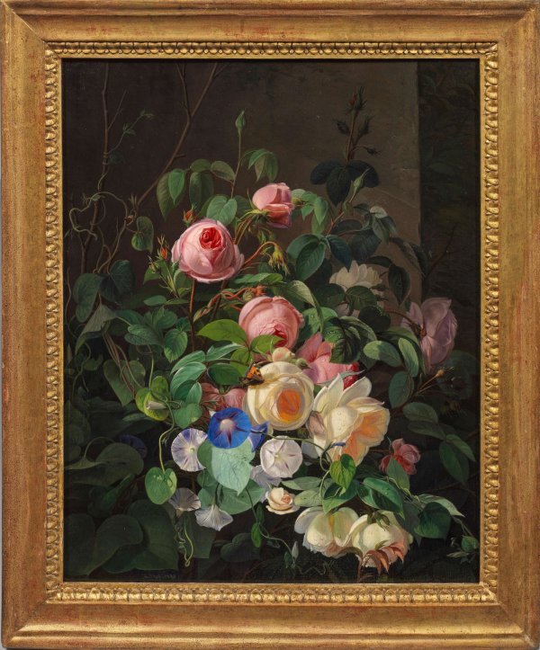 Durch eine effektvolle Lichtführung und ein hell leuchtendes Kolorit steigerte Balsgaard die Wirkung der duftigen, botanisch getreu gemalten, unterschiedlich farbigen Blüten. Virtuos benetzte er die Blumen mit Tau- bzw. Wassertropfen und belebte die brillant gemalte Darstellung durch einen kleinen Schmetterling. Künstlerisch herausragendes Werk des bedeutenden dänischen Malers, der sich nach seinem Akademie-Studium bei Christoffer Wilhelm Eckersberg, ab 1835 Früchte- und Blumenstillleben als Hauptsujets zuwandte. Ein Stipendium der Akademie ermöglichte es Balsgaard 1855/56 sich für zwei Jahre in Berlin, Dresden, Düsseldorf und Paris weiterzubilden. 1858 wurde er selbst in die Akademie gewählt, 1867 erhielt er den Professoren-Titel, 1892 wurde er zum Ritter des Dannebrogordens ernannt. Besonders schätzten ihn König Christian IX. v. Dänemark und seine Gemahlin Luise. Öl/Lwd.; L. u. sign.; 60 cm x 49 cm. Rahmen.