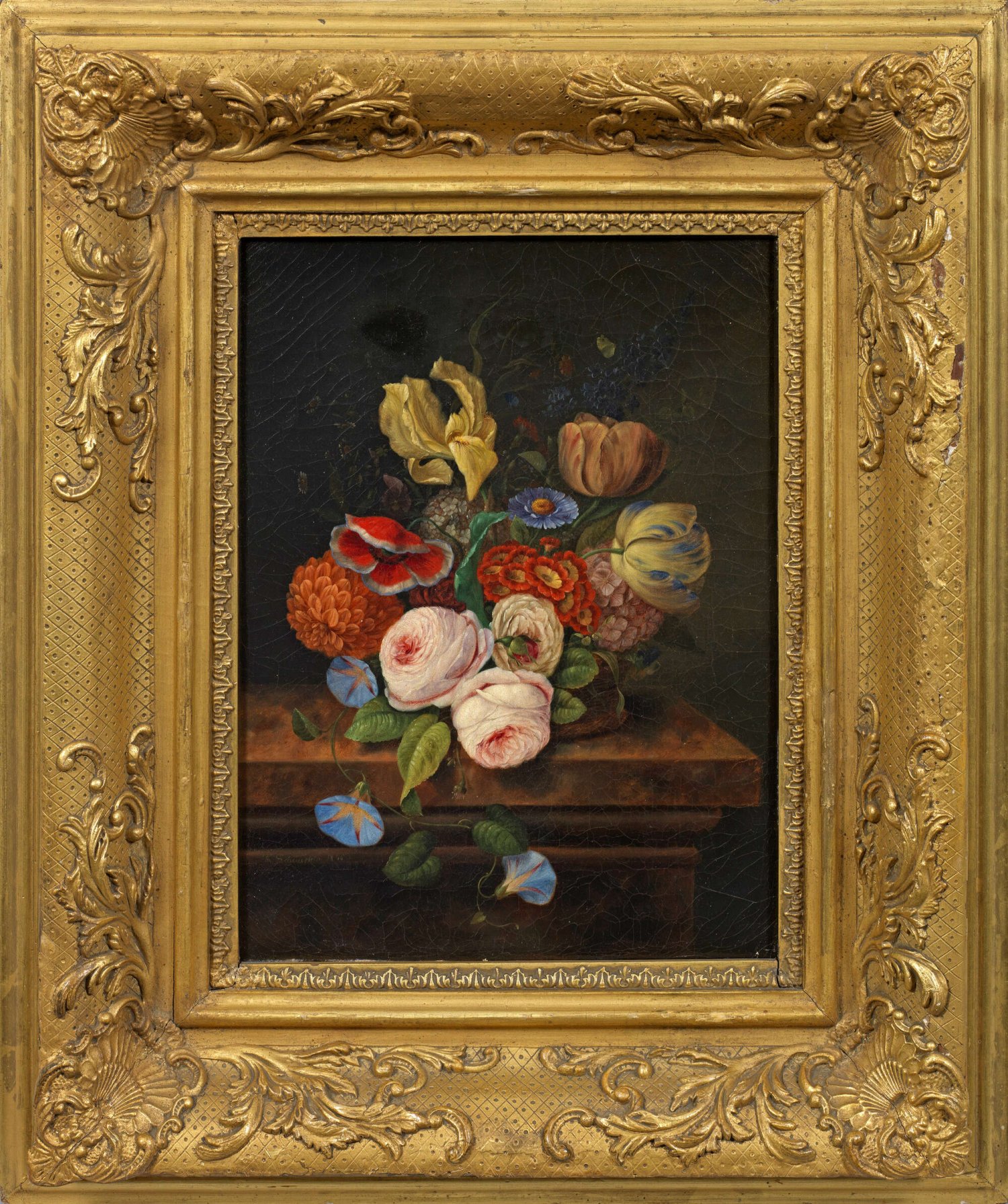 Auf einer steinernen Bank arrangiertes Stillleben aus verschiedenen Frühlings- und Sommerblumen mit üppigen, duftigen Blüten von rosafarbenen Rosen, Tulpen, Mohn, Schwertlilie, Dahlie, Primel und Himmelblauer Prunkwinde. In fein lasierender Malweise ausgeführtes, botanisch getreues, spätbiedermeierliches Werk des Künstlers, der mit Vorliebe virtuos ausgeführte Blumenstücke schuf. Öl/Lwd.; L. an der Steinbank sign. u. dat. 1856. 34,5 cm x 26,5 cm. Original-Rahmen.