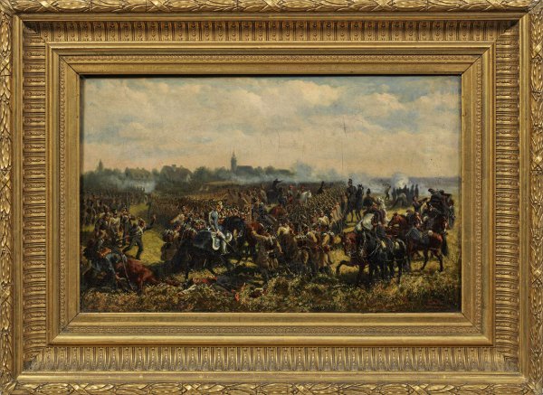 Auf einem Schlachtfeld sind Infanterie und Kavallerie aufmarschiert, Kanonenwagen von Pferden in Stellung gebracht. In der vordersten Front steigen bereits Rauchwolken auf. Die dramatische Erzählung zeugt von genauer Kenntnis der militärischen Details. Der Schlachtenmaler Emelé war, nach einer abgebrochenen militärischen Laufbahn und einem absolvierten Kunststudium in München bei F. Dietz, in Antwerpen ansässig, wo er 1854 die detailreiche Schlacht aus den Befreiungskriegen malte. Öl/Lwd.; R. u. sign. u. dat. "Antwerpen (18)54". 32,5 cm x 52 cm. Rahmen.
