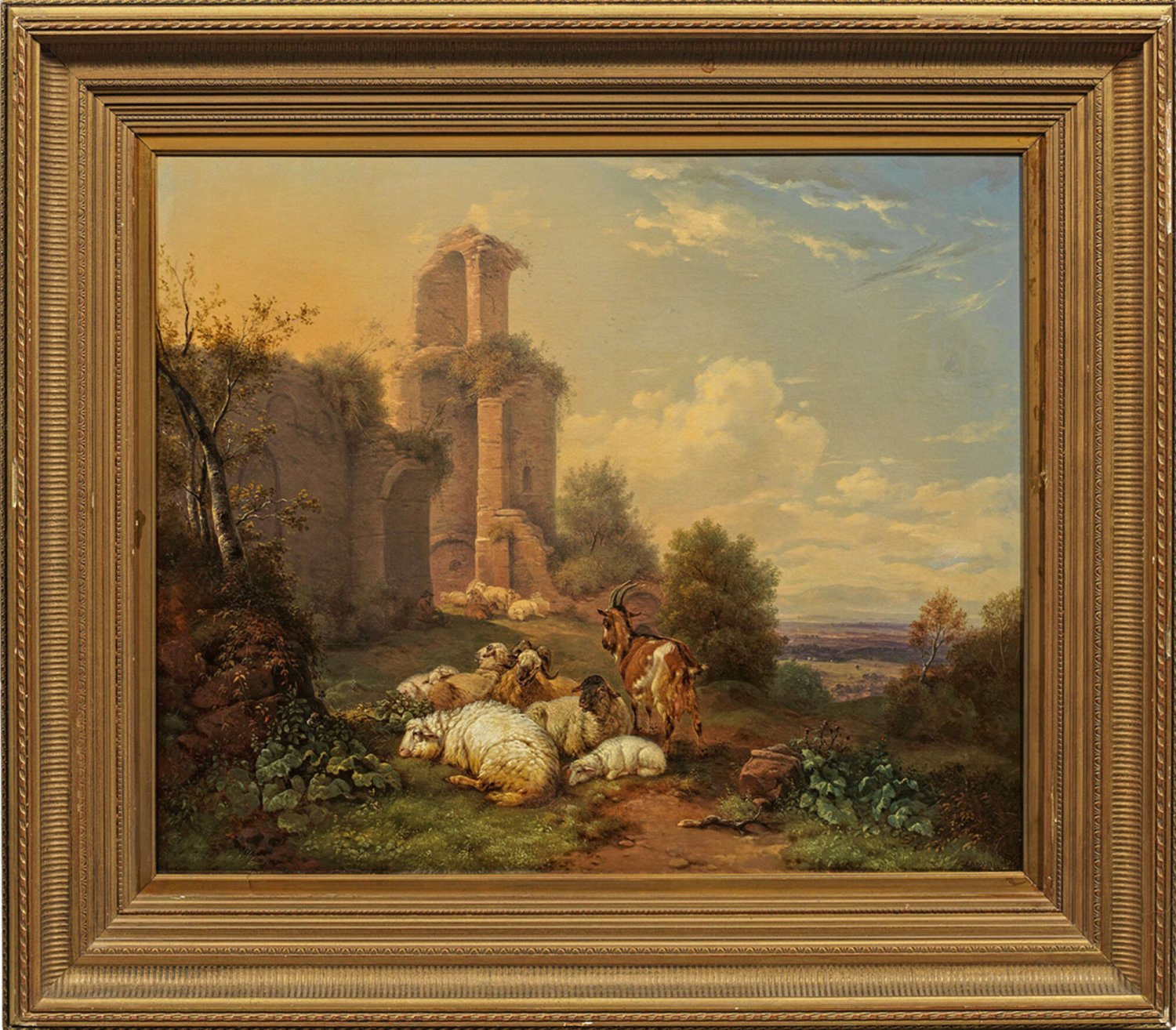 Abendstimmung mit rastendem Hirten an einer Ruine
