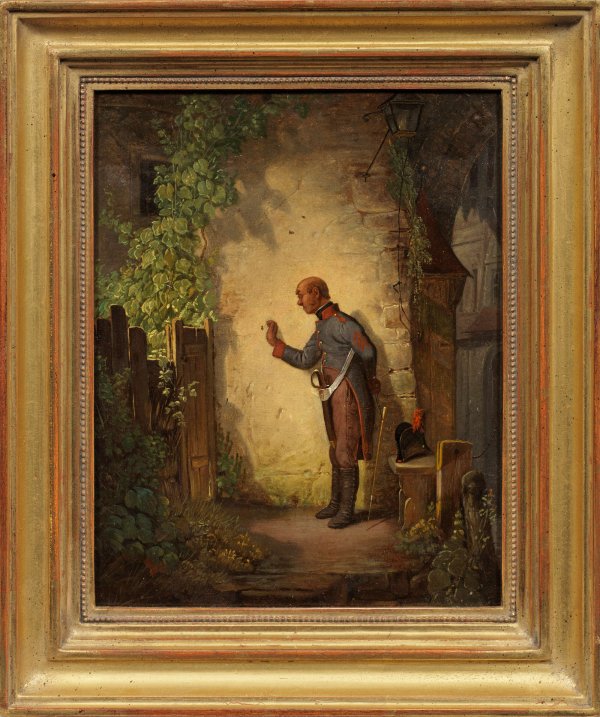 Feinmalerisch ausgeführte, 1860 entstandene, zeitnahe Darstellung nach dem berühmten Motiv, das Spitzweg um 1843 -1851 in mehreren dokumentierten Gemälde-Versionen schuf. Dargestellt ist ein sich langweilender, älterer Wachsoldat in Uniform der fränkischen Landwehr-Kreistruppen um 1820, der im Begriff ist, zum Zeitvertreib eine Fliege mit der rechten Hand zu fangen. Im Hintergrund rechts erscheint im Torbogen eine Stadtgasse. Die in der Lichtführung und mit wenigen Mitteln herausgearbeitete Farbperspektive überzeugt durch die Darstellung der Figur und die mit subtilem Humor geschilderte Situation des Augenblicks. Öl/Papier. Verso alte Widmung "Zur Erinnerung an deinen aufrichtigen Freund und Cousin (...) 2/12 (1)860". 27,5 cm x 21 cm. Rahmen.