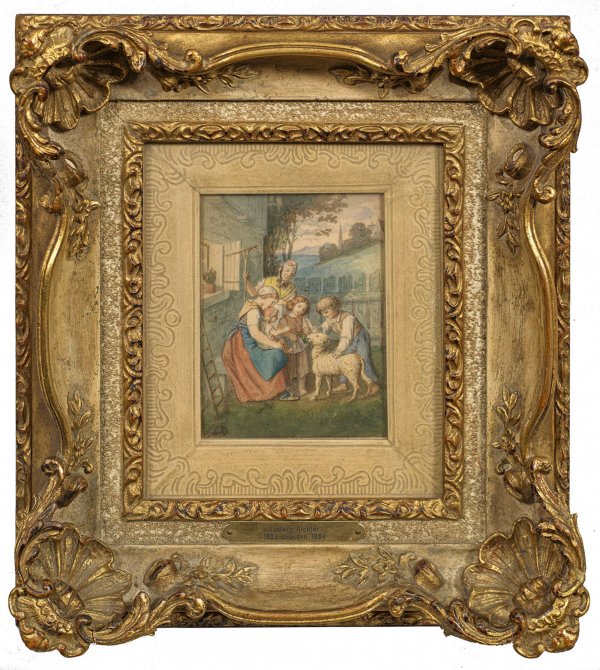 Szenische Darstellung im Garten eines Gehöftes mit einer Mutter und ihren Kindern beim Streicheln eines Schafes, hinter ihnen die Großmutter mit einem Rechen und Blick auf ein Kirchdorf. In dem für Richter charakteristischen, feinzeichnerischen Stil ausgeführtes, motivtypisches, biedermeierliches, heiter gestimmtes Blatt des Künstlers. Richter lernte bei seinem Vater, dem namhaften Zeichner und Kupferstecher Carl August Richter und studierte an der Dresdener Kunstakademie. Seine volksnahen, romantischen Zeichnungen und Illustrationen machten ihn ab 1838 weithin bekannt und populär. Er schilderte mit Vorliebe traute, stille Winkel und Szenen idealen, heimeligen Glücks, liebenswerte Kinder- und Märchenmotive. Am nächsten steht diesem reizvollen Blatt das später auch als Bildpostkarte verbreitete Aquarell "Mein Nest ist das best" mit einer vergleichbaren Szene. Aquarell u. Bleistift/Papier. L. u. monogr. "L R". Darstellung ca. 11,5 cm x 8,8 cm; Blatt 13 cm x 10,2 cm. Rahmen.