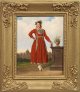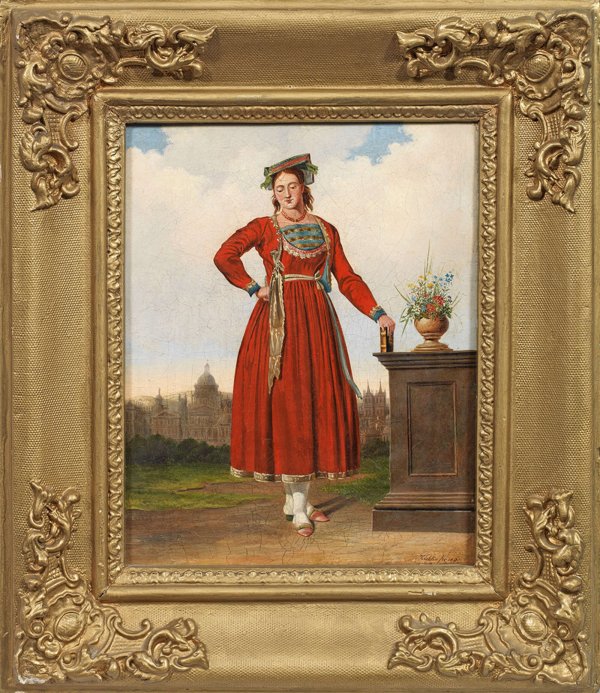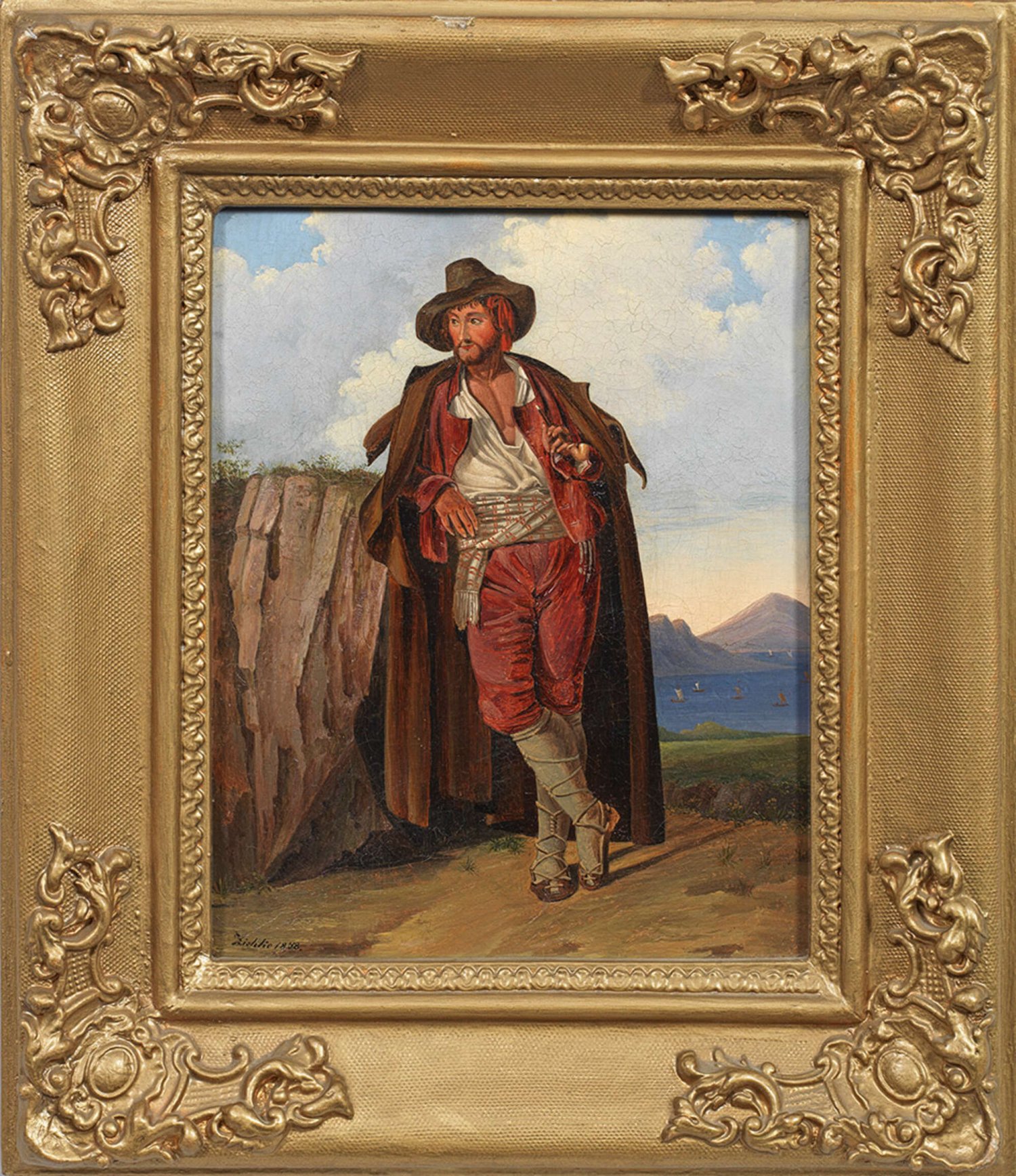A pair of paintings depicting a young Italian man and an Italian girl dressed in traditional costumes. Oil on canvas. Each signed and dated 1838. Old inscriptions on the reverse.
