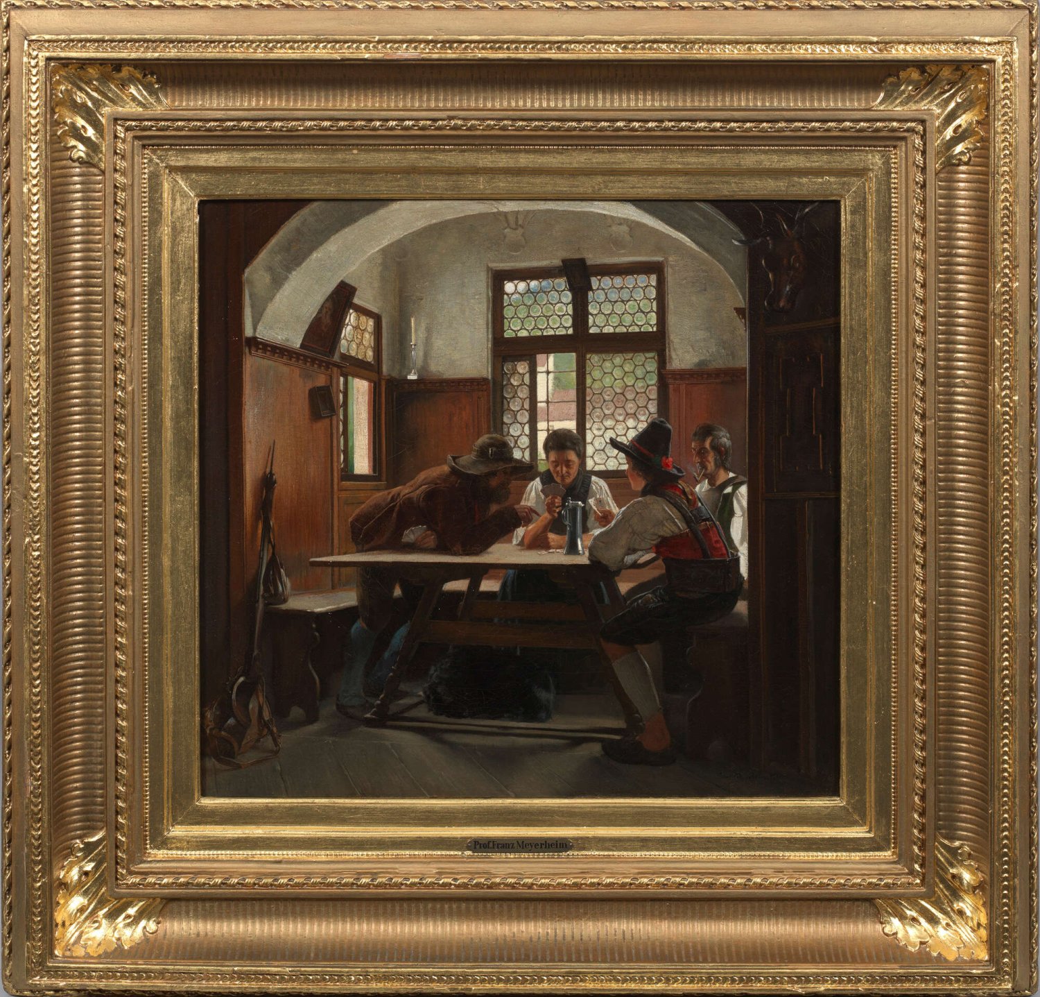 Interieurszene in der Nische eines Wirtshauses in Tirol. In der realistischen Figurenschilderung und der Stimmung meisterhaftes, frühes Werk des aus einer bedeutenden Künstlerfamilie stammenden Malers. Seinen ersten künstlerischen Unterricht bekam Meyerheim durch seinen Vater Friedrich Eduard Meyerheim, schon mit 16 Jahren ging er 1854 an die Kunstakademie seiner Heimatstadt und wechselte vier Jahre später an die Kunstakademie Düsseldorf. Neben Hessen und Tirol bereiste Meyerheim auch Belgien, Italien und die Schweiz. Öl/Lwd.; R. u. sign. u. dat. 1861. Verso auf Rest eines Original-Austellungsetiketts bez. u. betitelt. 44 cm x 48,5 cm. Original-Rahmen.