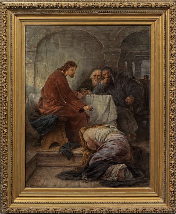 Szenische Darstellung nach Lukas (7,36-50) mit den beiden Pharisäern und Christus, dem die Sünderin die Füße salbt. Realistisches, reifes Werk des Malers, der an der Kunstschule in Stuttgart und an der Akademie in München bei Bernhard von Neher, Heinrich von Rustige und Wilhelm von Lindenschmidt studierte. 1883 wurde er selbst als Professor an die Stuttgarter Kunstschule berufen, wo u. a. Maria Caspar-Filser und Oskar Schlemmer zu seinen Schülern zählten. Öl/Lwd.; L. u. sign. u. dat. 1901. 87 cm x 67,5 cm. Rahmen.