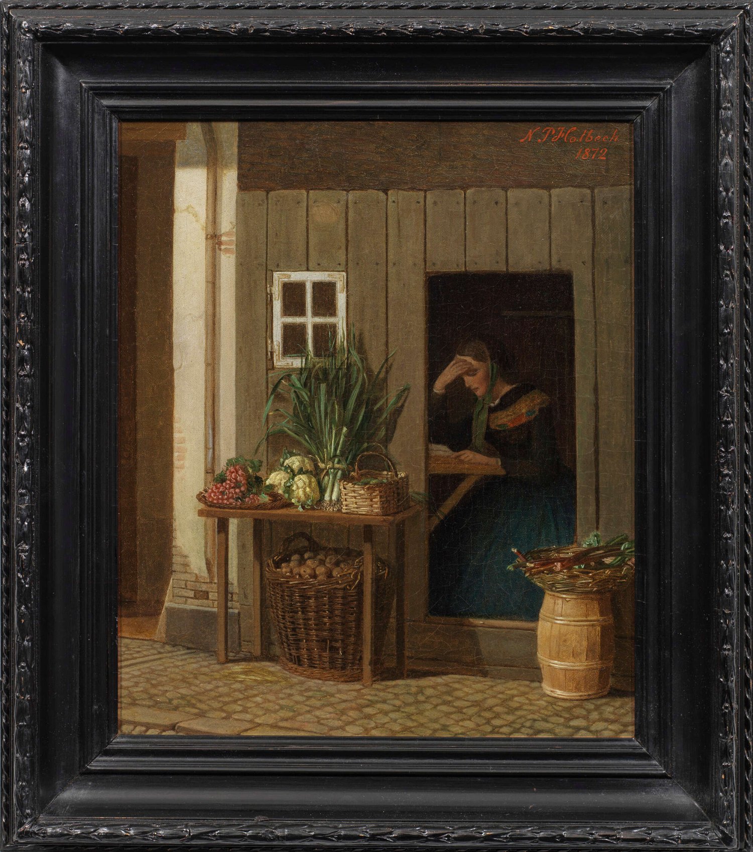 Im spätbiedermeierlichen Stil gemaltes, stimmungsvolles, realistisches Genrebild des dänischen Künstlers. Holbech studierte 1819-1824 an der Akademie in Kopenhagen bei Christian August Lorentzen und Christoffer Wilhelm Eckersberg. 1830 ging er nach Rom, um seine Karriere als Maler fortzusetzen, wo er im Haus seines Mentors Bertel Thorvaldsen lebte. 1834 kehrte Holbech nach Kopenhagen zurück, dort wurde vor allem wegen seiner Porträts ein gefragter Maler. Daneben schuf er einige historische Szenen (erworben von der königlichen Sammlung) und reizvolle Genrebilder wie das vorliegende. 1824-1872 war Holbech oft auf den Akademie-Austellungen in Charlottenburg vertreten. Öl/Lwd.; R. o. sign. u. dat. 1872. Verso nochmals bez. u. dat.; 34,5 cm x 29,5 cm. Wohl Original-Rahmen.