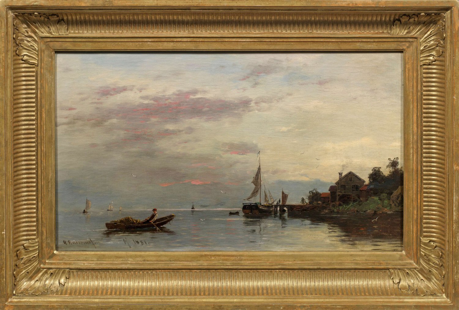 Sommerliche, impressionistisch aufgefasste Landschaft Rasmussens, in der er den besonderen Stimmungsreiz, die Atmosphäre, das Licht und die Natur des Fjords einfing. Typisches Werk des norwegischen Malers, der an den Akademien in Kopenhagen und Düsseldorf bei Oswald Achenbach und Hans Gude studierte. Öl/Lwd.; L. u. sign. u. dat. 1881 mit Ortsangabe Düsseldorf. 38,5 cm x 68 cm. Rahmen.