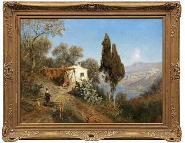 Blick auf einen Berghang mit kleinem, pittoreskem, von Bäumen und Kakteen umstandenem Haus und Figurenstaffage, im Hintergrund der Nemisee und die Stadt in duftig hellem, mediterranem Licht. Atmosphärisch gestimmtes, um 1880 entstandes Werk Lutteroths, das ihn als virtuosen Koloristen zeigt. Lutterroth studierte 1864-1867 bei Oswald Achenbach an der Düsseldorfer Akademie. 1868-70 verbrachte Lutterroth in Rom und unternahm Studienreisen durch Italien. 1880/81 zeigte Lutteroth vergleichbare Nemisee-Motive auf Austellungen in Berlin und Düsseldorf. Über Hamburg hinaus erlangte er einen bedeutenden Ruf als Landschaftsmaler. Besonders das Kronprinzenpaar Friedrich Wilhelm und Victoria schätzten ihn persönlich. Öl/Lwd.; L. u. sign.; Verso nochmals vom Künstler betitelt (sign.) u. bez. mit Ortsangabe Hamburg. 74 cm x 99 cm. Rahmen.