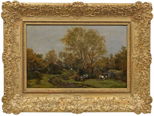 Diese in der feinfühligen Erfassung der Natur und des diffusen Lichts subtil geschilderte Stimmungslandschaft Menards steht ganz in der Tradition der Schule von Barbizon, die er von Kindesbeinen an kannte - Corot, Millet und andere Maler der Künstlergruppe hatten das Elternhaus besucht und ihn früh mit ihren Werken vertraut gemacht. Ménard studierte ab 1880 an der Académie Julian, 1904 wurde er selbst Professor an der Académie de la Grande Chaumière. Ménard beschickte zahlreiche Einzel- und Gruppenausstellungen, 1897 die Ausstellung der Münchener Secession, große Erfolge hatte er besonders in Galerien in den den USA. Öl/Holztafel. L. u. sign.; 31,5 cm x 51,5 cm. Rahmen.