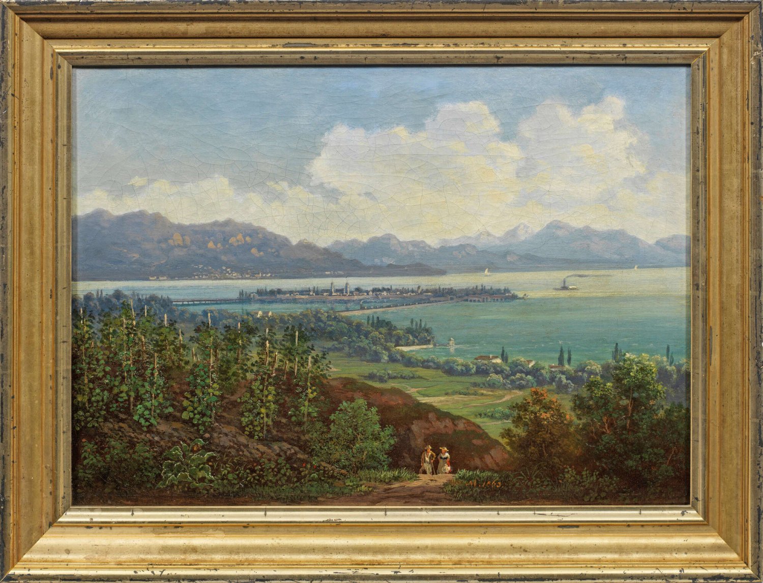 Sommerlicher, panoramaartiger Blick von Bad Schachen mit Weinberg auf die Altstadtinsel von Lindau im Bodensee. Spätbiedermeierliche, romantische Landschaft mit duftig bewölktem Himmel und koloristisch subtiler Wiedergabe der Lichtstimmung. Öl/Lwd.; R. u. neben den Figuren monogr. u. dat. 1863. 33 cm x 46,5 cm. Rahmen.