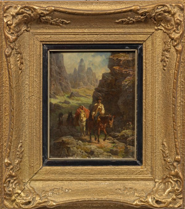 Die realistische Genremalerei des Münchner Kleinmeisters kennt vor allem ein Thema: das Pferd als Helfer und Fortbewegungsmittel des Menschen. Die ein wenig an Spitzweg erinnernde Lastenkarawane auf südosteuropäischem Gebirgspfad ist ein typisches Werk des Künstlers. Öl/Holztafel. L. u. sign.; 20 cm x 16 cm. Rahmen.