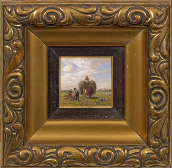 Miniatur-Gemälde. Öl/Malkarton. L. u. sign.; Verso alter Klebezettel mit Provenienzangaben (Otto v. Müller bzw. Ilse v. Müller) u. Dat. Weihnachten 1918. 6 cm x 6 cm. Rahmen.