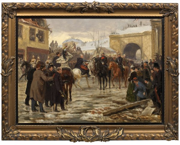 Vielfigurige szenische Darstellung des historischen Ereignisses mit dem Einmarsch preußisch-sächsischer Kavallerie-Truppen der Maas-Armee unter Führung des Kronprinzen Albert von Sachsen. Dieser fand am 16.09.1870 statt, wodurch sich der Belagerungsring um die Stadt Paris schloss. Im Zentrum der Komposition wird geschildert, wie ein kommandierender französischer Offizier demütig Albert seinen Säbel als Symbol der Übergabe der Stadt reicht. Roesslers Stil und Bildsprache ist durchaus realistisch und sachlich, indem er sowohl die Sieger als auch die Besiegten sowie die materiellen Zerstörungen zeigt. Nur sehr moderat und ganz am Rand klingt eine Verherrlichung des militärischen Ereignisses an, wenn der Künstler die schwarz-weiß-rote Fahne des Norddeutschen Bundes über dem Stadttor wehen lässt. Adalbert von Roessler besuchte die Akademien von München, Antwerpen und Berlin. In letzterer war er 1888/89 Meisterschüler bei Anton von Werner, der ihn - wie es auch in diesem Gemälde zum Ausdruck kommt - mit seinem Realismus stark beeinflusste. Mit Vorliebe malte Roessler Szenen aus dem Deutsch-Französischen Krieg von 1870/71, mit denen er seit 1887 auch mehrfach auf den Großen Berliner Kunstaustellungen und den Akademie-Ausstellungen vertreten war. Öl/Lwd; R. u. sign.; 72,5 cm x 100 cm. Rahmen.