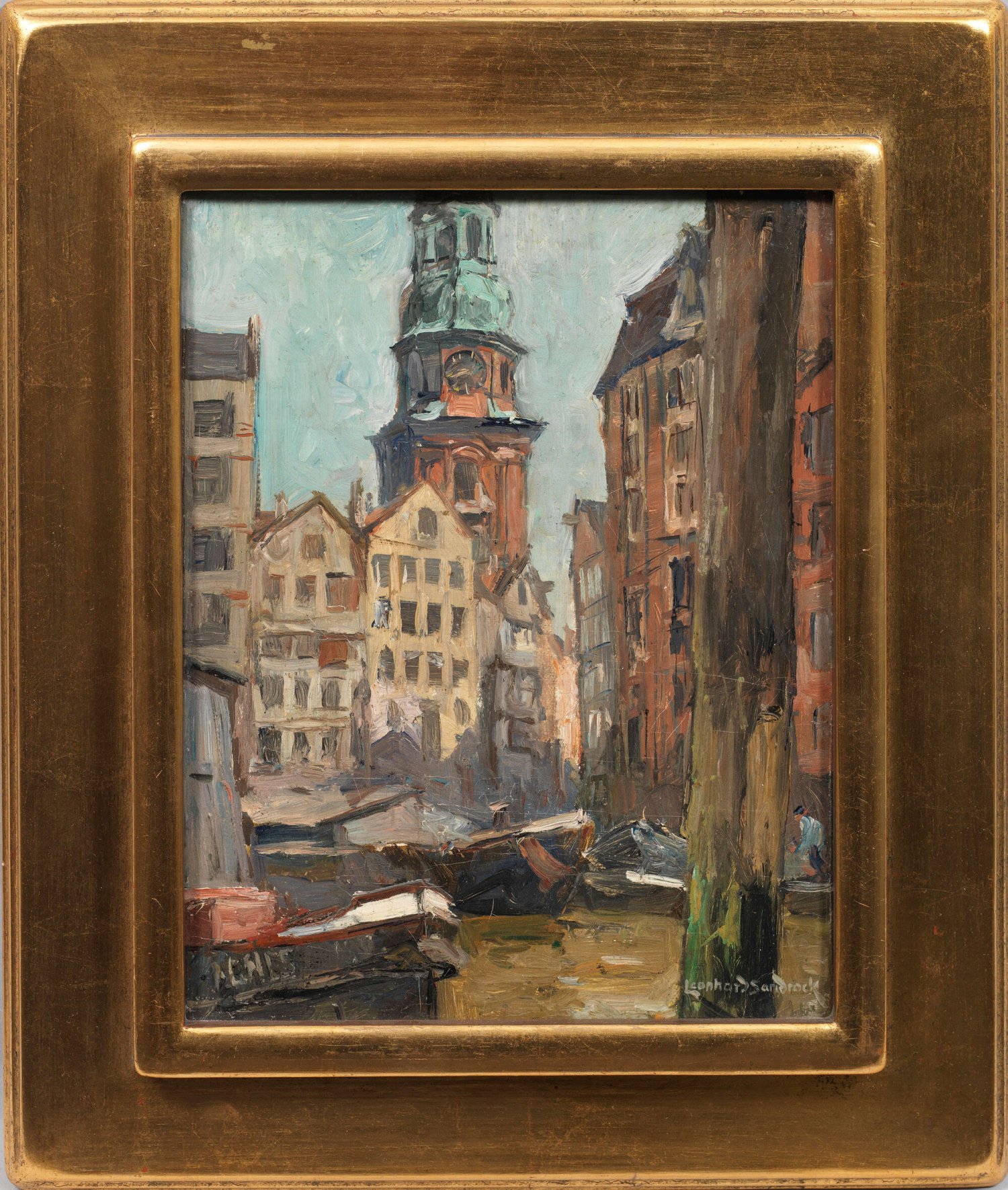 Blick von einem mit Schiffen dicht besetzten Fleet auf barocke Handelshäuser und die Kirche. Impressionistisches, mit schnellem, breitem Duktus und weich-pastosem Farbauftrag gemaltes Werk Sandrocks aus einer Reihe von Hafenmotiven bzw. Hamburg-Veduten. Der von Hermann Eschke ausgebildete Künstler widmete sich mit großer Leidenschaft der maritimen Thematik. Eine der Städte, die den Künstler hierbei stark inspirierten, war Hamburg - mindestens 29 Gemälde, Aquarelle und Grafiken sind eindeutig der Hansestadt und dem Hafen zuzuordnen. 1897 debütierte Sandrock in der Großen Berliner Kunst-Ausstellung mit dem Gemälde "Abend im Hafen"; 1914 zeigte er dort auch ein Hamburger Fleet-Motiv, 1918 eine Ansicht von St. Katharinen. Öl/Lwd., doubl.; R. u. sign.; 33 cm x 26 cm. Rahmen.