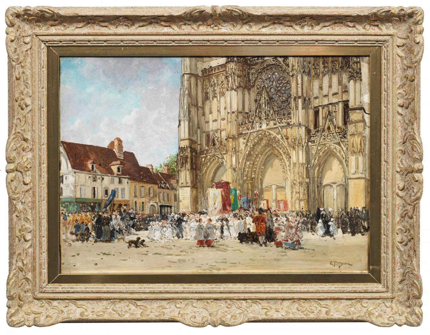 Vielfigurige, sommerlich heitere Szene an der Westfassade der Kathedrale, die zu den bedeutendsten Denkmälern der französischen Gotik gehört. Impressionistisches Werk Petitjeans mit subtil eingefangener Lichtstimmung. Der Landschaftsmaler debütierte 1874 auf dem Salon und war seit 1883 Mitglied der Société des Artistes Français. Seine Gemälde wurden auf zahlreichen Ausstellungen prämiert, darunter 1889 und 1900 auf den Pariser Weltausstellungen sowie 1890 im Münchener Glaspalast. Öl/Lwd.; R. u. sign.; Verso Malwarenstempel von Alexis Ottoz, Paris. 39 cm x 54,5 cm. Rahmen.