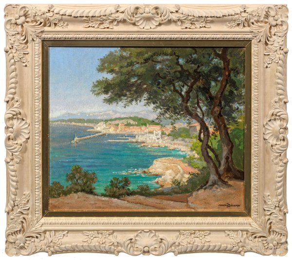 Kraftvolle Farbimpression von der Côte d'Azur, die ein so heute aufgrund neuer Bebauung nicht mehr gegebenes Panorama festhält. Der sonst überwiegend für seine Stillleben bekannte französische Spätimpressionist Décamps malte vereinzelt auch Landschaftsbilder mit Motiven aus Südfrankreich, die heute besonders gesucht sind. Öl/Lwd.; R. u. sign.; Verso betitelt; 46 cm x 55 cm. Rahmen.