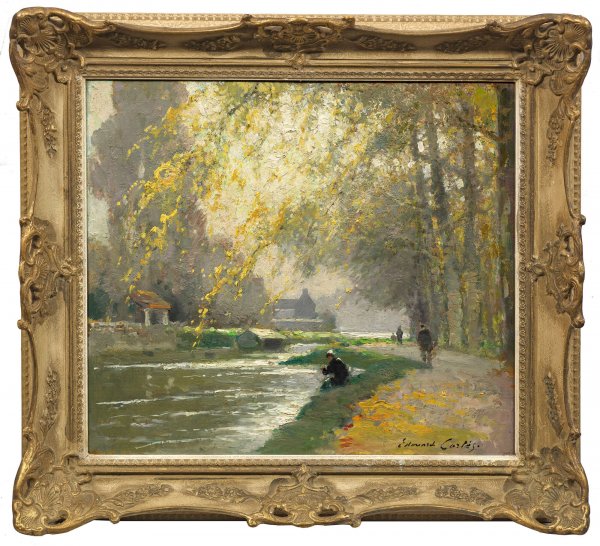 Blick auf den sonnenbeschienenen, von Bäumen umsäumten Fluss mit Spaziergängern und sitzender Figur am Ufer. Stiltypische Landschaft des Spätimpressionisten, der zu Beginn des 20. Jhs. vor allem durch seine Paris-Veduten mit Straßenszenen bekannt wurde, die zu den schönsten und begehrtesten Ansichten der Stadt gehören. Ab Mitte der 1920er Jahre war Cortès in Lagny in der Normandie ansässig, wo neben seinen gefragten Szenen aus Paris ein reiches Oeuvre an Landschaften entstand. Öl/Sperrholztafel. R. u. sign.; Verso betitelt. 46 cm x 53 cm. Rahmen.