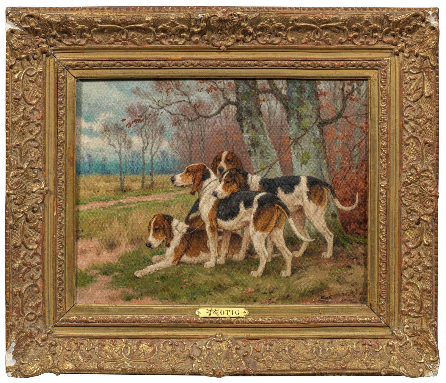 Lebendige Schilderung der Hunde in weiter, baumbestandener, herbstlich gestimmter Landschaft. Realistisches, naturnahes Werk des bekannten Tiermalers. Rötig studierte an der École des Beaux-Arts in Paris bei Benjamin Constant, Georges Lefebvre und Jean Paul Laurens. 1894 debütierte er auf dem Salon des Artistes Français, wo er 1902 und 1904 mit Medaillen ausgezeichnet wurde. 1913 erhielt er zudem den Prix Rosa Bonheur. Öl/Lwd.; R. u. sign. u. dat. (19)30. 27 cm x 35 cm. Rahmen.