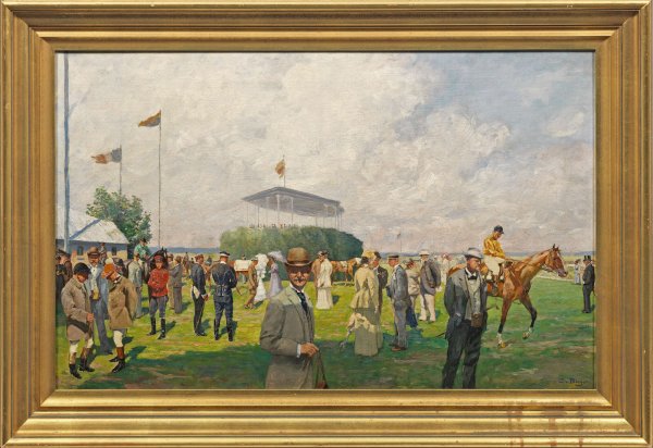 Vielfigurige, heiter gestimmte Szene mit eleganten Jockeys, Herren und einigen Damen am Sattelplatz, im Hintergrund eine einzelne, abgesetzte Tribüne. In der Erfassung des Lichts künstlerisch herausragendes, impressionistisch aufgefasstes Gemälde in frisch leuchtendem Kolorit, das zugleich in höchst prägnanter Weise das Wesentliche der soignierten Figuren zum Ausdruck bringt. Öl/Lwd.; R. u. sign.; 60 cm x 95 cm. Rahmen.