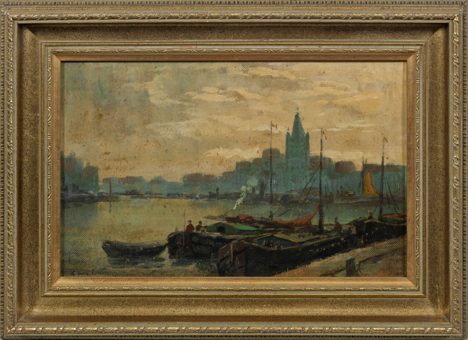 Impressionistische Vedute der Haager Schule, rechts im Hintergrund wohl das "Witte Huis". Van Waning schilderte ab 1898 mit Vorliebe Flussszenerien in Den Haag, Amsterdam und Rotterdam. Öl/Lwd., alt auf Sperrholztafel kaschiert. L. u. sign.; Verso nochmals sign. mit Ortsangabe Rotterdam. 23,5 cm x 36,5 cm. Rahmen.