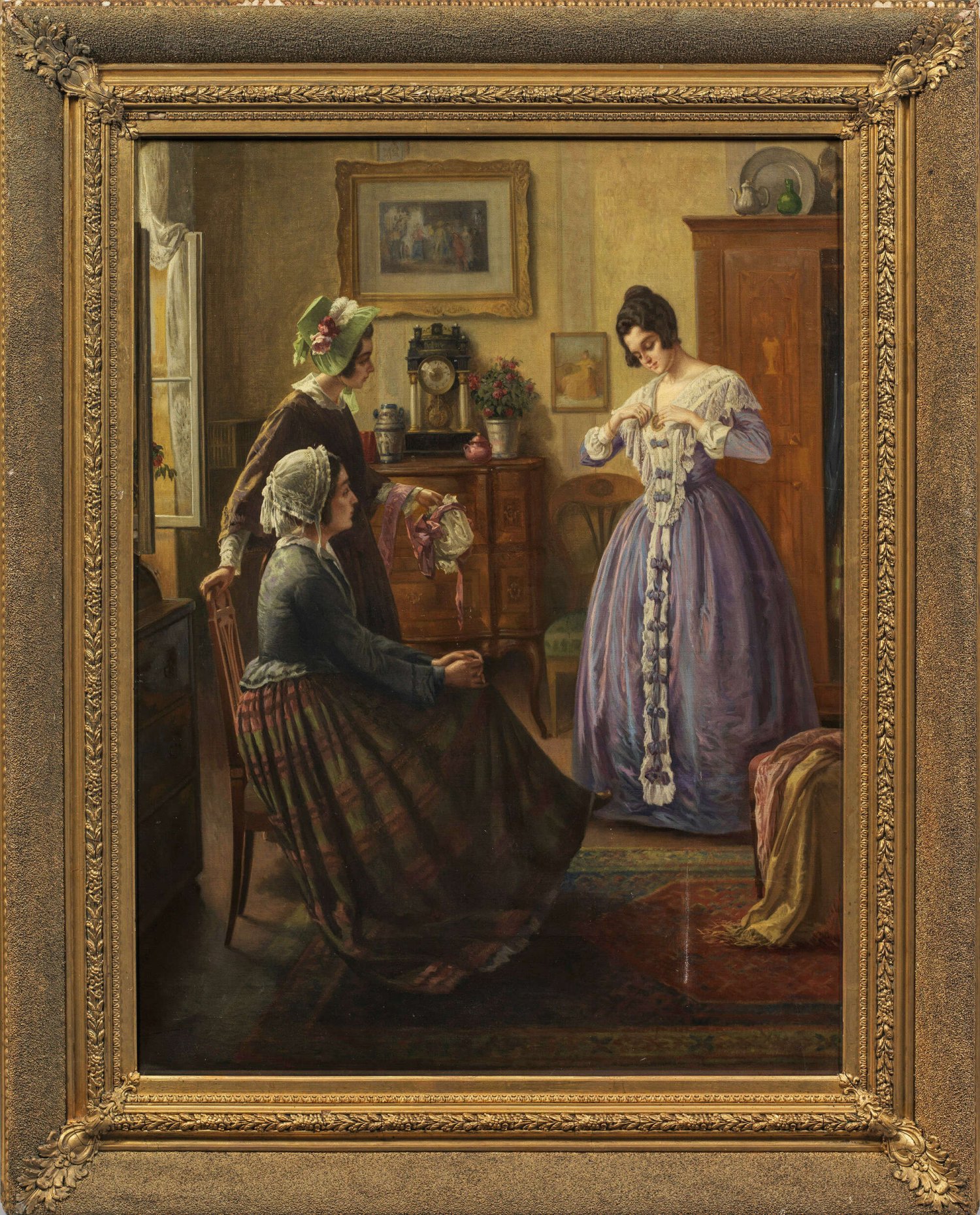 Biedermeier-Interieur mit junger Dame beim Vorführen ihres neuen Kleides