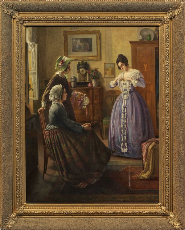 Stimmungsvolles Genrebild des Künstlers, der außer Landschaften mit Vorliebe solche Interieurs mit Damen in der heimeligen Welt des Biedermeier malte. Schuster studierte 1887-1896 an der Wiener Akademie und wurde 1902 Mitglied des Künstlerhauses. Öl/Lwd.; R. u. sign.; Ger. Läsur an der Lwd.; 113 cm x 86,5 cm. Rahmen.