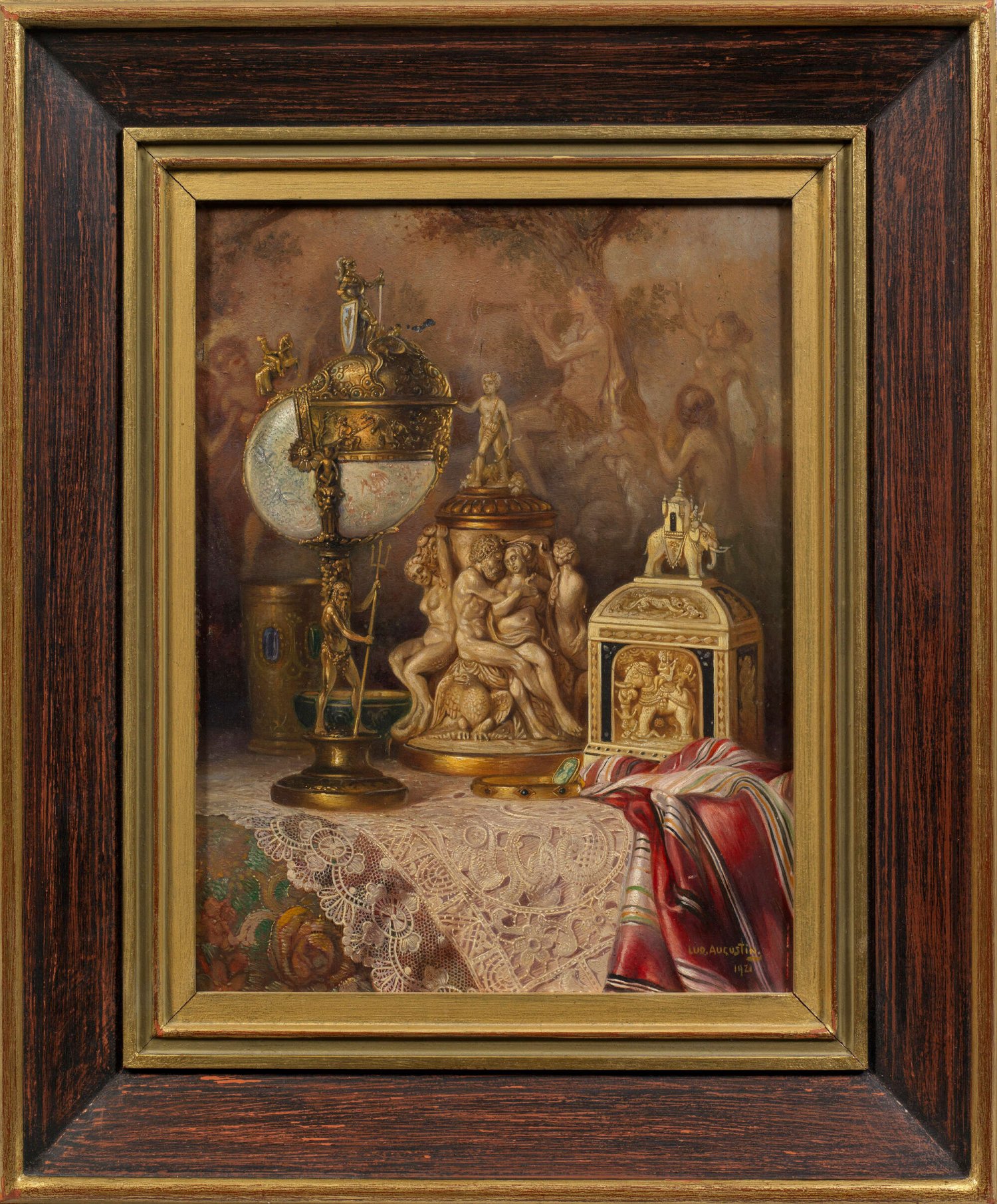 In seiner Stofflichkeit virtuos gemalte Darstellung eines kostbaren Nautiluspokals mit vergoldeter, figürlicher Silbermontierung, eines figürlichen Elfenbeinhumpens sowie einer asiatischen Schatulle mit Elefantenreitern. Motiv- und stiltypisches Werk des auf derartige Stillleben und historisierende, galante Genreszenen spezialisierten Malers. Öl/Holztafel. R. u. sign. u. dat. 1920(?). 35 cm x 26,7 cm. Rahmen.