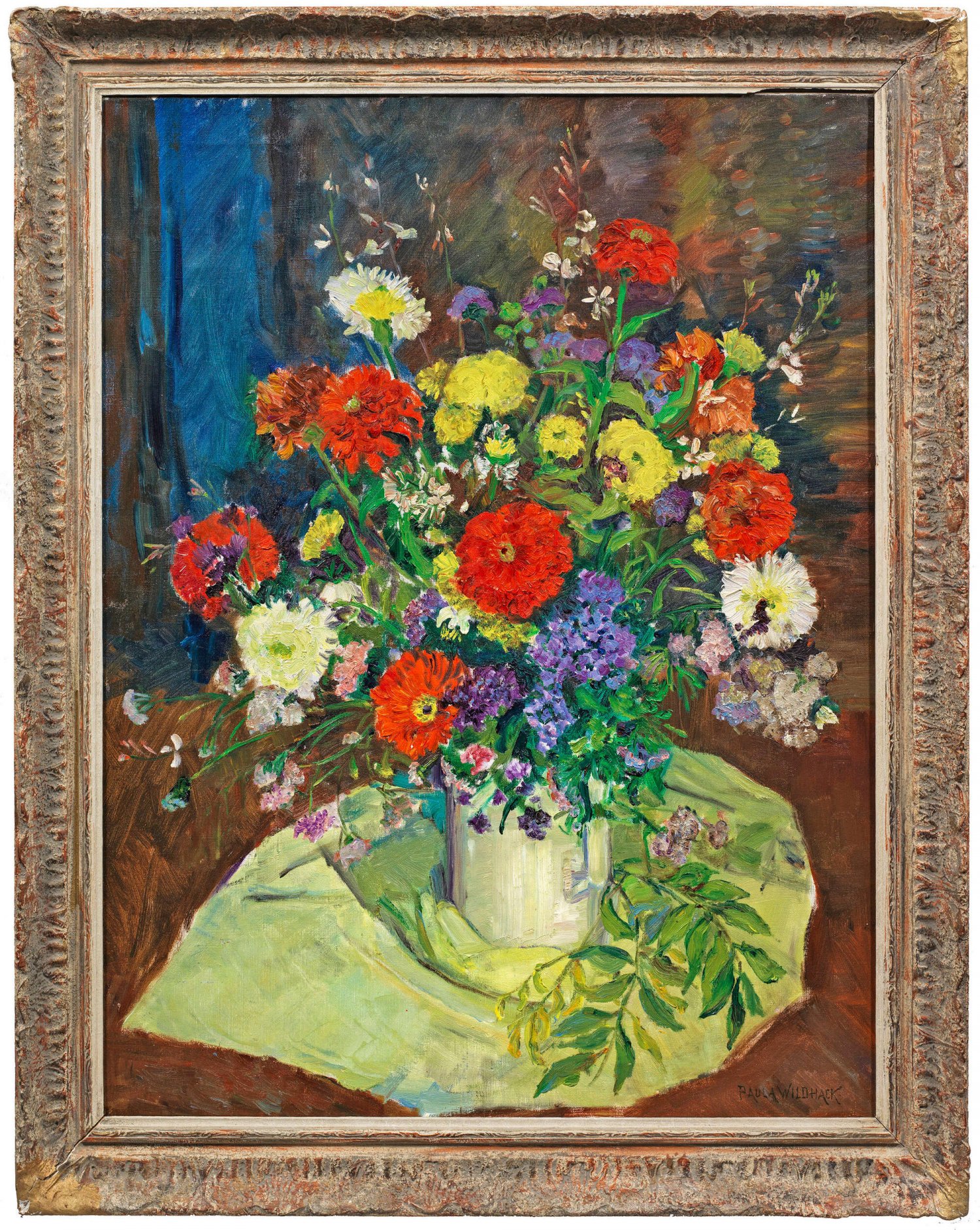 Farbenprächtiges, spätimpressionistisches Stillleben. Paula Wildhack, eine Tochter des Malers Andreas Wildhack, wurde künstlerisch besonders durch die Impressionistin Olga Wisinger-Florian geprägt, deren Schülerin sie war. Öl/Lwd.; R. u. sign.; 94 cm x 73 cm. Rahmen.