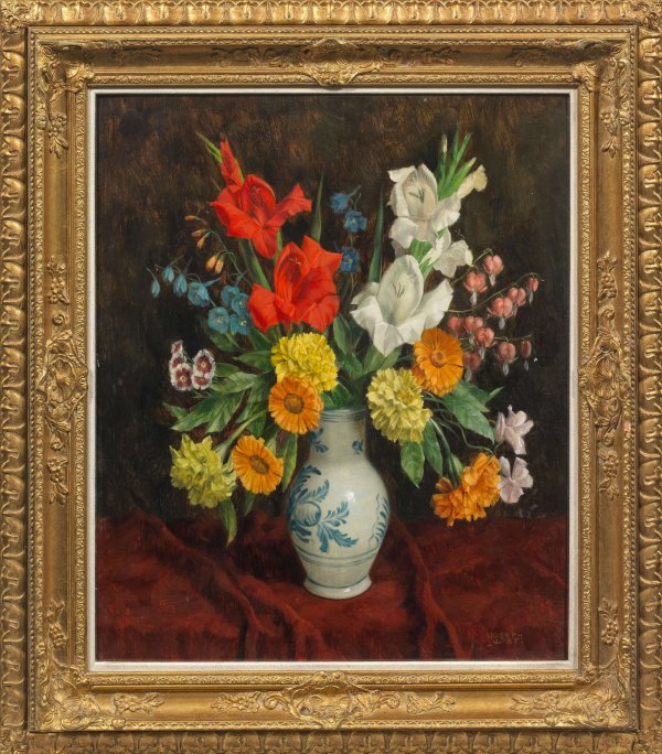 Feinflüssig und duftig gemaltes, typisches Werk Josts, dessen Blumenstillleben nicht zuletzt wegen ihrer Farbenfreude einen großen Liebhaberkreis fanden. Jost war Meisterschüler von Franz Rumpler an der Wiener Akademie und stellte ab 1908 im Wiener Künstlerhaus aus, dessen Mitglied er 1920 wurde. Öl/Holztafel. R. u. sign.; 68 cm x 55.5 cm. Rahmen.