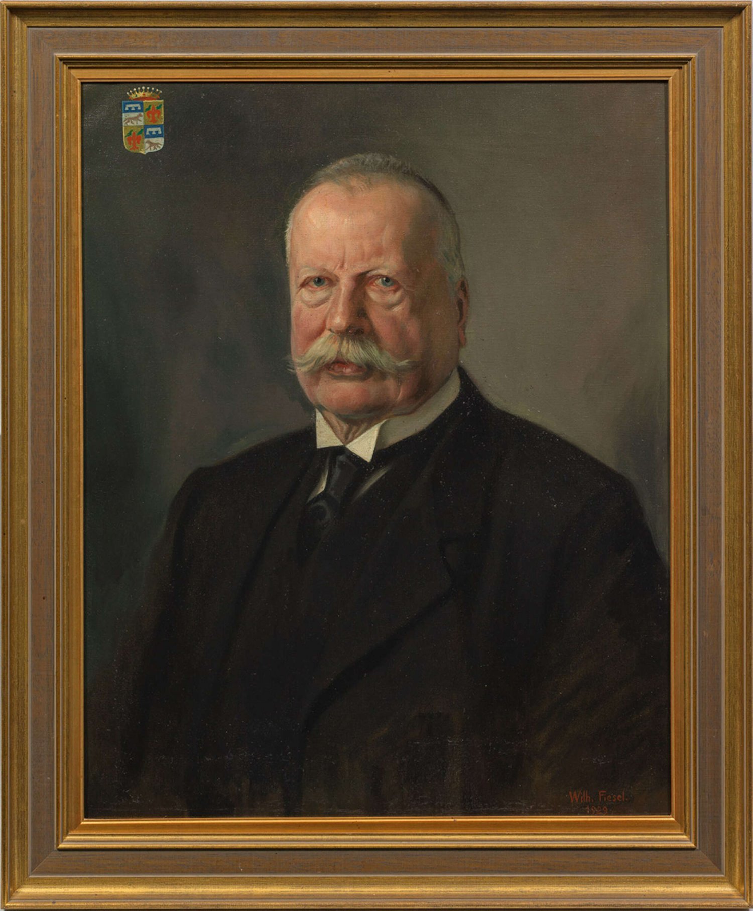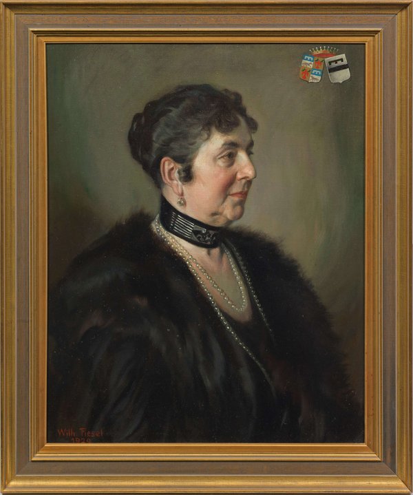Gegenstücke. Repräsentative, ausdrucksvoll charakterisierende Brustbildnisse. Dargestellt sind Levinus Wilhelm Maria-Hermann Hubert Reichsgraf von Wolff Metternich zur Gracht (1847 - 1939) in dunklem Anzug und seine Frau Leontine Sophie geb. Freiin von Broich (1846 - 1946) mit Perlenschmuck in einem dunklen Pelz, den Kopf in Viertel- bzw. Dreiviertelprofil gewandt. In einer der oberen Ecken jeweils ein Wappen. Fiesel studierte ab 1903 an der Akademie der Bildenden Künste in München und war später vor allem als Porträtmaler tätig. Öl/Lwd.; L. u. bzw. r. u. sign. u. dat. 1929. 78 cm x 63,5 cm. Rahmen.