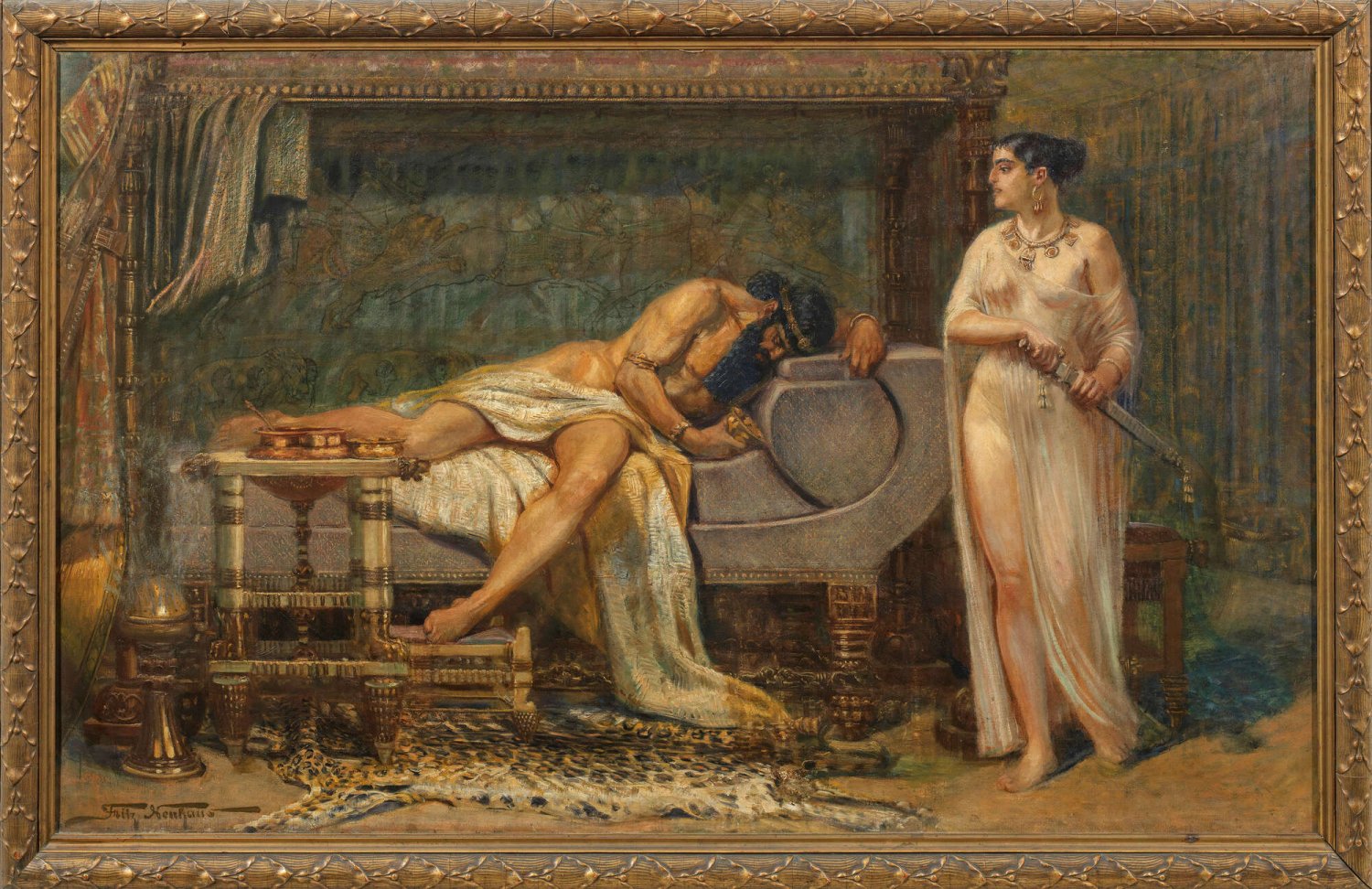 Szenische Darstellung mit Judith, die im Begriff ist, das Schwert gegen den assyrischen, trunkenen, schlafenden König Holofernes zu ziehen um ihn zu enthaupten. Imposantes, großformatiges Jugendstil-Gemälde mit ausdrucksvoller Darstellung der biblischen Geschichte, die schon in der Renaissance und dem Barock ein zentrales Motiv der abendländischen Kunstgeschichte war. Um 1900 griffen Künstler wie Gustav Klimt und Franz von Stuck das Judith-Thema wieder auf, schilderten insbesondere deren verführerische Erotik und damit auch die tiefenpsychologisch bedrohliche Macht der Frau über den Mann. Öl/Lwd.; L. u. sign.; 107 cm x 174 cm. Originalrahmen.