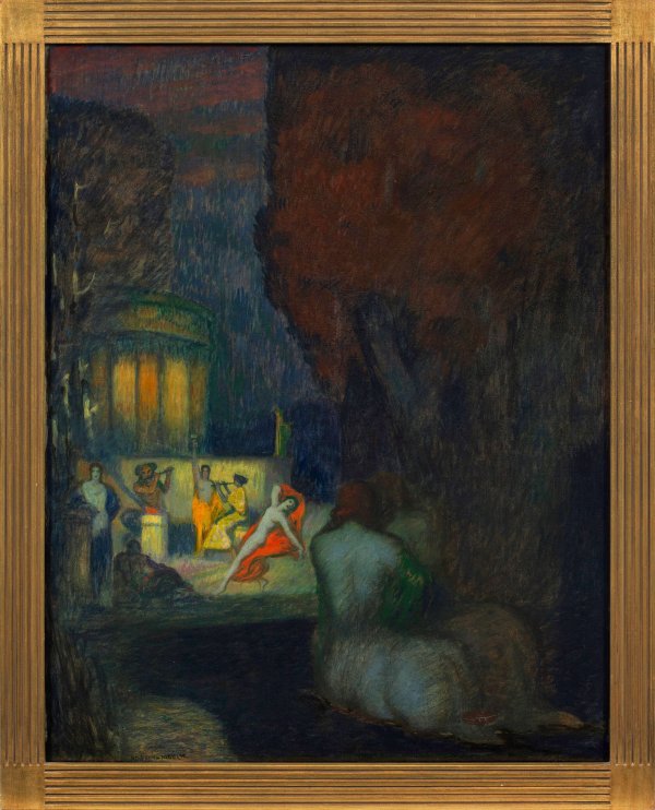Szene vor einem Tempel mit tanzender Baccantin. Das in vorwiegend tonigem Kolorit und wenigen leuchtenden Farbakzenten angelegte, motiv- und stiltypische Gemälde gehört zu den Jugendstil-Gemälden des Schweizer Malers, durch die er bekannt wurde. Oft stellte er hierin mythologische und bacchantische Szenen dar, stark beeinflusst von Franz von Stuck, dessen Assistent er 1909 in München wurde. Öl/Lwd.; L. u. sign.; Geringf. Läsur in der Lwd.; 90 cm x 72,5 cm. Rahmen.