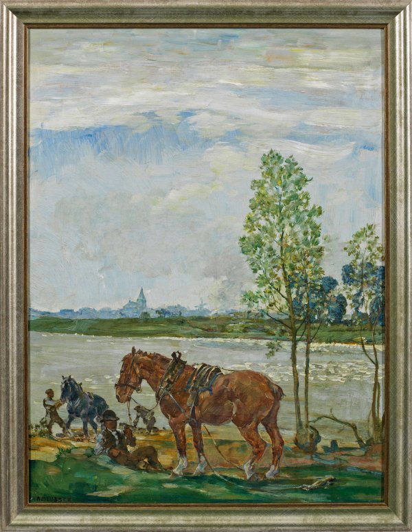 Blick vom rechten Rheinufer auf die Stadt. Deusser fand unter dem Einfluss von Liebermann und Trübner als einer der ersten Düsseldorfer Künstler zum Impressionismus und gehörte zu einem kleinen Kreis anderer fortschrittlicher Maler wie Max Clarenbach und Walter Ophey. Mit Vorliebe schilderte der zeitweilig in Monheim ansässige Deusser Pferdemotive, die er 1908 u. a. in der Kunsthalle Düsseldorf mit Erfolg ausstellte und fortan als Anführer der "Düsseldorfer Moderne" galt. 1909 wurde er Mitbegründer des "Sonderbundes", der durch legendäre internationale Ausstellungen in Düsseldorf und Köln 1909-1912 der Moderne in Deutschland zum Durchbruch verhalf. Öl/Lwd., doubl.; L. u. sign.; 56,5 cm x 43 cm. Rahmen.