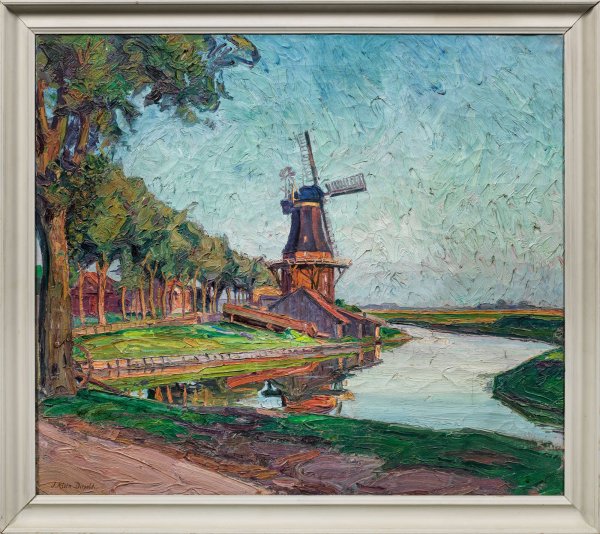 Spätimpressionistische, mit schnellem, breitem, virtuos lockerem Duktus und pastosem Farbauftrag gemalte Sommerlandschaft, die wohl ein Motiv in der Krummhörn bzw. in Greetsiel zeigt. Klein v. Diepold studierte 1884-1893 an der Düsseldorfer und Antwerpener Akademie; 1919 kam er zum ersten Mal nach Ostfriesland, wo er wenige Jahre später dauerhaft ansässig und zum bedeutendsten Schilderer der dortigen Landschaft wurde. Öl/Lwd.; R. u. sign.; 90 cm x 105 cm. Rahmen.