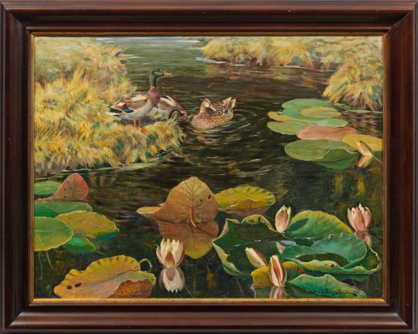 Großformatiges, spätimpressionistisches Landschaftsgemälde. Blick von schräg oben auf einen ins Abendlicht getauchten, moorigen Teich mit blühenden, sich bereits schließenden Seerosen und drei Enten im Röhricht. Der schwedische Tiermaler Gislander malte mit Vorliebe in der freien Natur Smalands. Öl/Lwd.; R. u. sign. und dat. 1930; 76 cm x 101 cm. Rahmen.