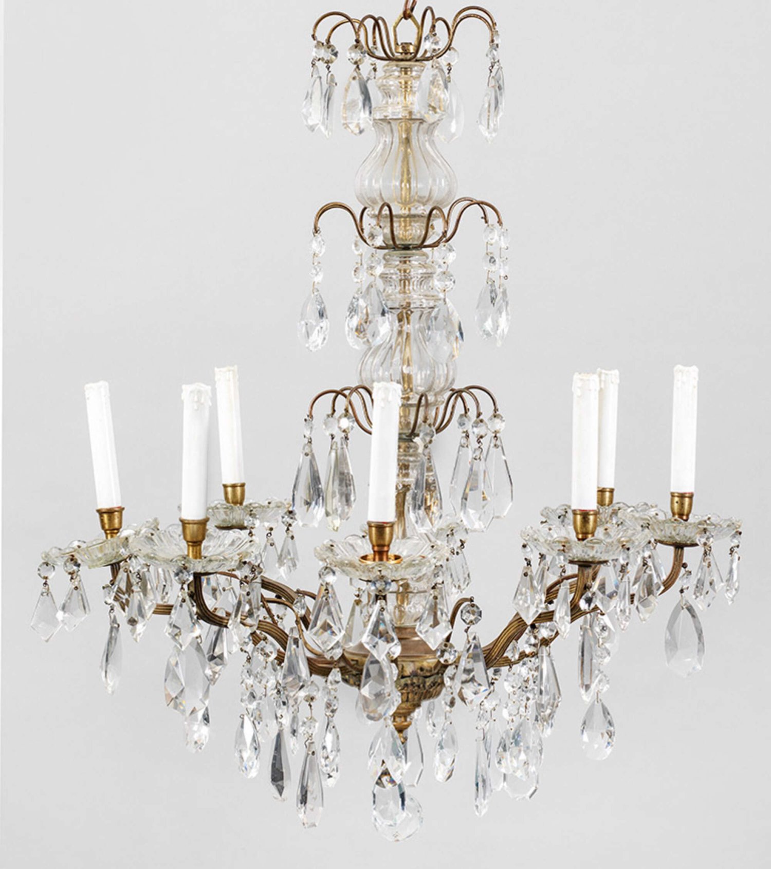 Belle Epoque-Deckenlüster 8-flg.; Messing und farbloses Kristallglas. Mehrfach geliederter Balusterschaft. Unterhalb davon ausgehend flach geschweifte Leuchterarme mit hohen zylinderförmigen Tüllen über großen Traufschalen. Bekrönung in Form von geschwungenen Streben. Reicher Behang aus großen, facettierten Prismen. Elektrifiziert. H. 77 cm. D. 65 cm.