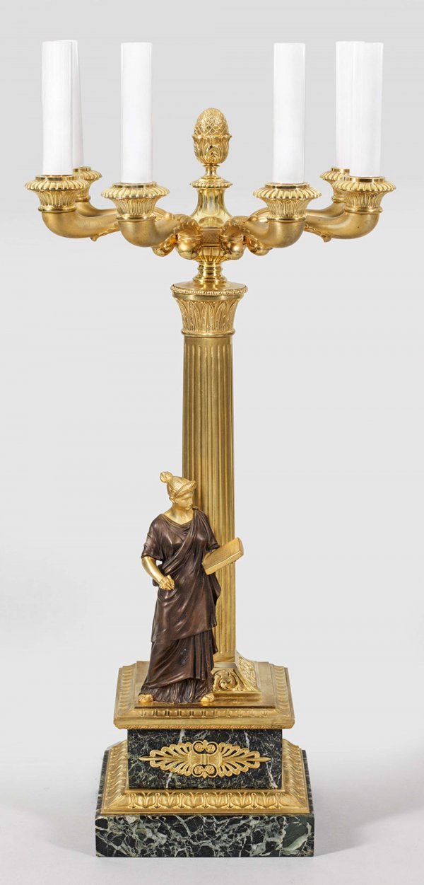 Große Empire-Salonlampe 6-flg.; Bronze, vergoldet bzw. teilw. dunkel patiniert sowie grün gemaserter Marmor. Über gestuft ansteigendem Sockel mit umlaufendem Zungenfries und applizierten Palmetten kannelierter Säulenschaft, begleitet von vollplastisch gestalteter, antikisierender Figur. Oberhalb davon ausgehend flach geschweifte Leuchterarme mit zylinderförmigen Tüllen und Knaufbekrönung. Neu elektrifiziert. Ges.-H. 83 cm.