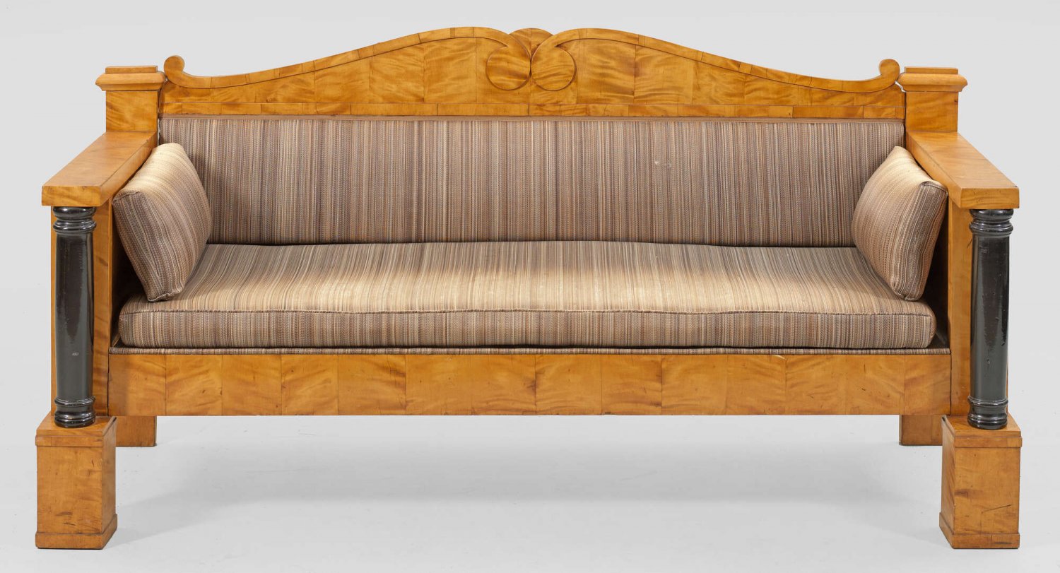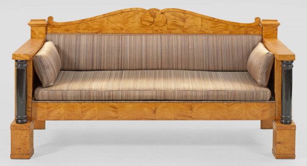 Großes Biedermeier-Sofa Birkenholz, furniert und teilw. ebonisiert. Gerade Zarge, flankiert von breiten, gekanteten Armlehnen mit eingestellten Vollsäulen auf kräftigen Sockeln. Geschweift ansteigende Rückenlehnenrahmung aus gegeneinander gestellten Voluten. Sitzfläche und Lehne aus Polsterelementen, mit braungestreiftem Rosshaar bezogen. H. 99,5 cm. 203 cm x 78 cm. Sitz-H. 49 cm.