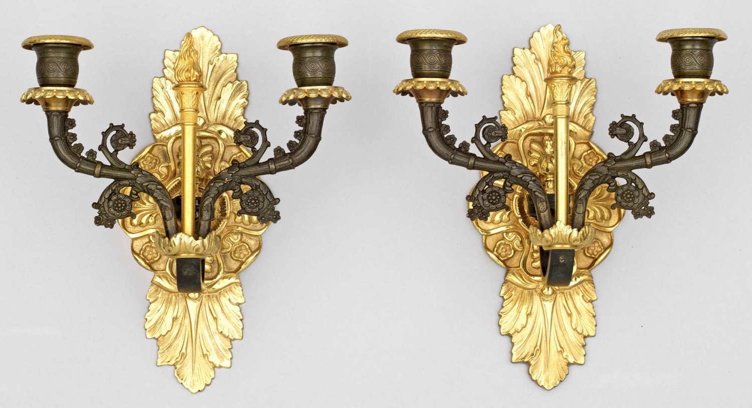 Paar Charles X-Wandappliken 2-flg.; Bronze, vergoldet bzw. teilw. dunkel patiniert. Flaches Wandschild aus zentraler Rosette und Palmetten. Mittig davon ausgehend gebogte Strebe als Träger für geschwungene Leuchterarme mit vasenförmigen Tüllen. Bohrung für Elektrifizierung. H. 26 cm.