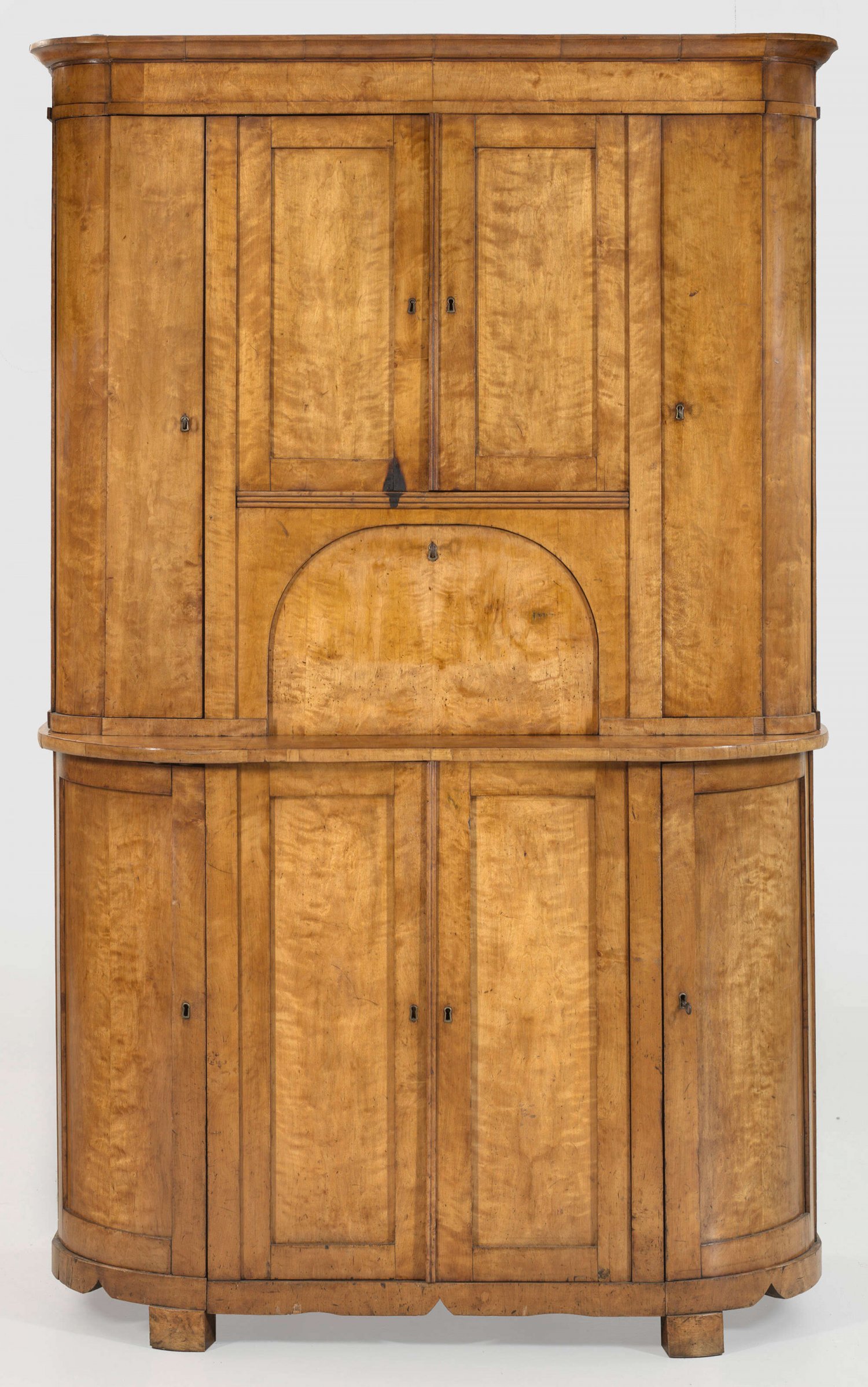 Großer Biedermeier-Geschirrschrank Birkenholz, furniert. Gerader viertüriger Korpus mit stark bombierten Seiten auf gekanteten Füßen. Weit zurückgesetzter, korrespondierender Aufsatz mit flachem Gesims. In der gegliederten Front vier Türen unterschiedlicher Größe sowie Klapplade mit eingezogenem Segmentbogen. Innen Ablagefächer und kleine Schubladen. H. 215 cm. 139 cm x 65 cm.