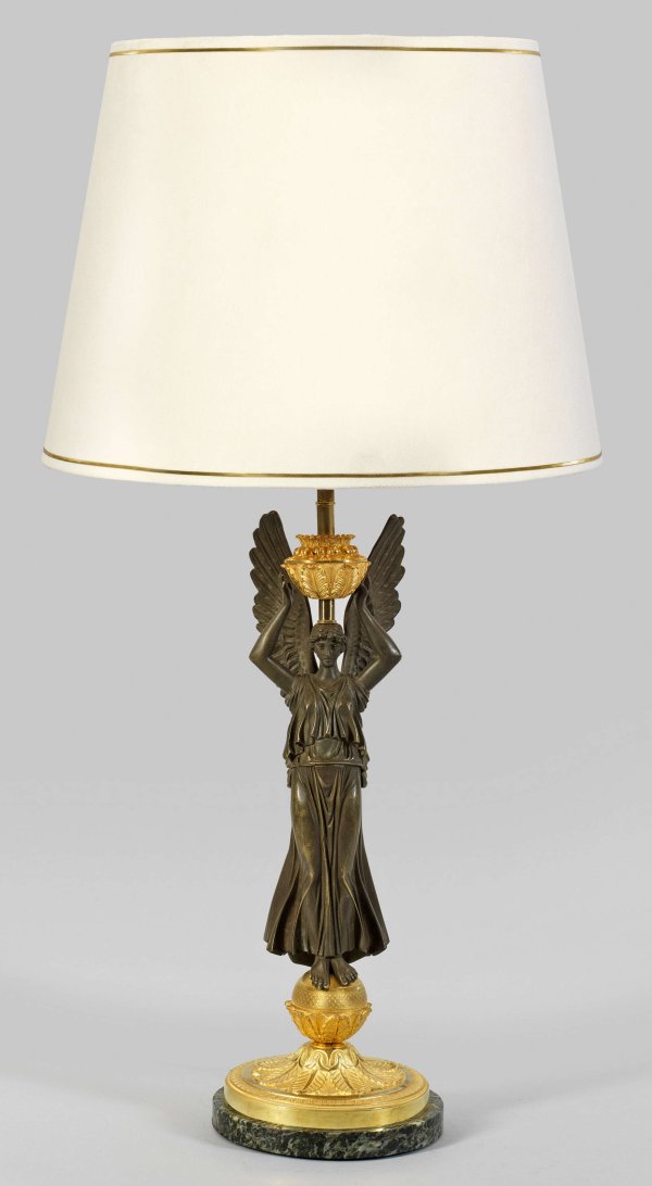 Große Empire-Tischlampe 1-flg.; Bronze, vergoldet bzw. teilw. dunkel patiniert sowie grün gemaserter Marmor. Über gestuft ansteigendem Rundsockel mit breitem Palmettenfries vollplastisch gestaltete Viktoria als Träger für Leuchtmittel. Leicht konischer, elfenbeinfarbener Lampenschirm. Elektrifiziert. H. 80 cm.