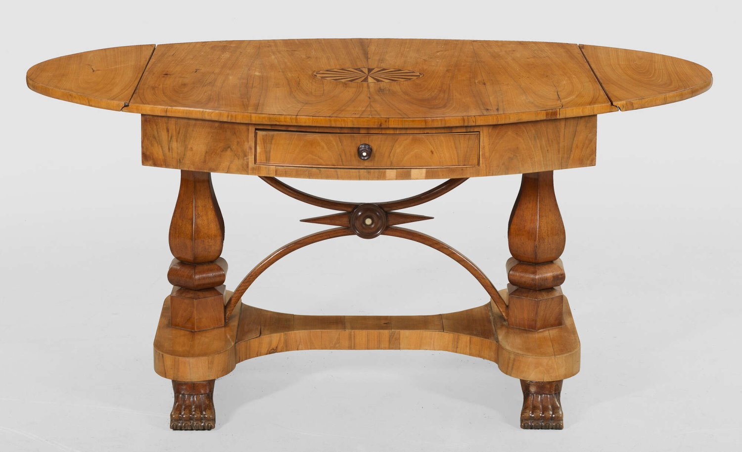 Biedermeier-Klapptisch Nussbaum, furniert. Bombierter, zweischübiger Zargenkasten auf mehrfach gekanteten Balustersäulen, dazwischen, durch gebogte Streben verbunden. Unterhalb konkav eingezogene Sockelplatte auf Tatzenfüßen. Gering überstehende, seitlich aufstellbare Deckplatte mit eingelegtem Rosettenmotiv. H. 76,5 cm. 109/155 cm x 81 cm.