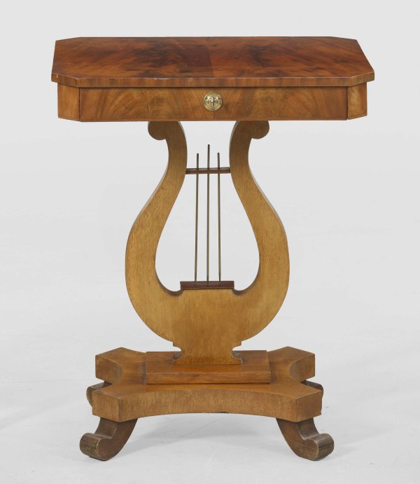 Biedermeier-Beistelltisch Mahagoni, furniert. Über konkav eingezogener Sockelplatte auf Volutenfüßen durchbrochen gestaltetes Lyraelement als Träger für einschübigen Zargenkasten mit angeschrägten Ecken sowie gering überstehender Deckplatte. H. 72,5 cm. 58 cm x 43 cm.