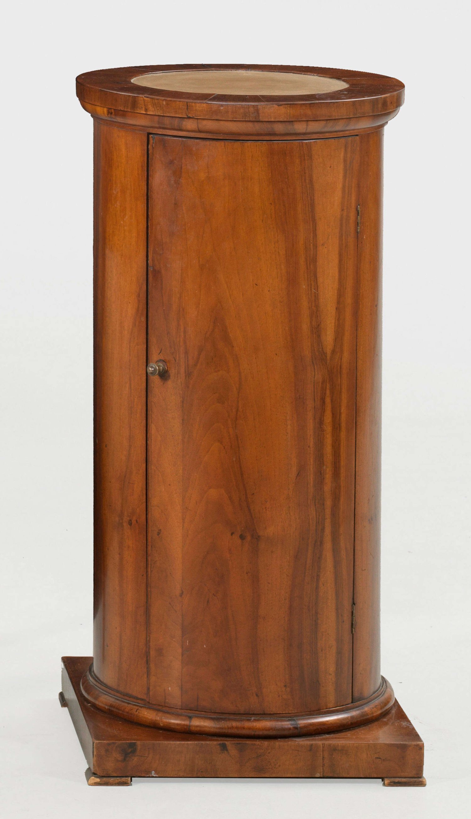 Biedermeier-Trommelschrank Nussbaum, furniert. Über quadratischer Sockelplatte zylinderförmiger, eintüriger Korpus mit profilgerahmter, runder Deckplatte. H. 89 cm.