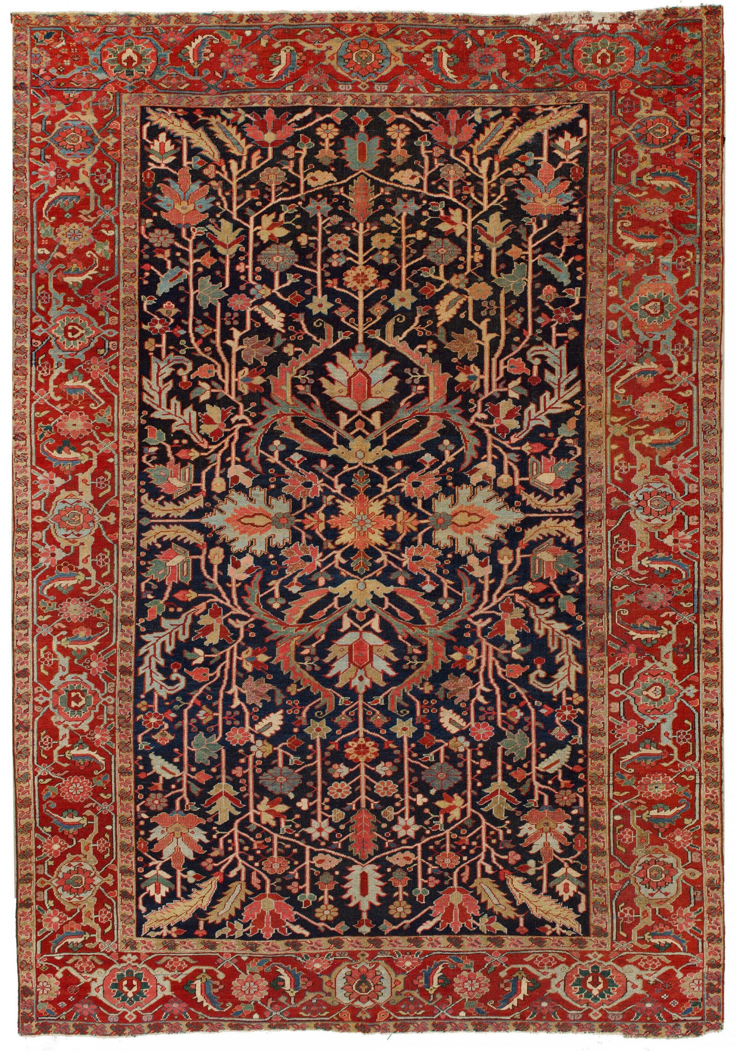 Großer antiker Heriz-Teppich Persien. Ende 19. Jh.; Wolle auf Baumwolle. Im dunkelblauen Innenfeld flächendeckende Musterung aus zentriert angeordneten großen Blattmotiven sowie arabesk angeordneten Zweigen aus Lanzettblättern und Blütenrosetten. Umlaufend breite rotgrundige Hauptbordüre aus großen Palmetten. 283 cm x 264 cm.