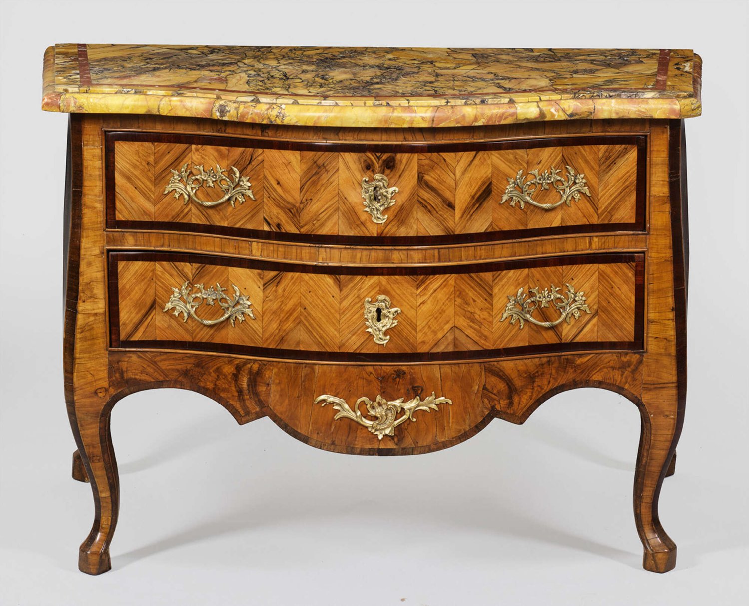Elegante Louis XV-Kommode Nussbaum und Nussbaummaser, furniert sowie Bandeinlagen aus Mahagoni. Sich nach hinten verbreiternder Korpus, flankiert von schmalen Ecklisenen auf passig geschweifter Zarge und stark geschwungenen Volutenbeinen. In der gegliederten Front zwei breite Schubladen. Flächendeckend breit gerahmte, schauseitig gespiegelt angeordnete Furnierfelder, von Bandeinlagen begrenzt. Korrespondierende Deckplatte aus ockerfarbenem, grau gemasertem Marmor mit rotbrauner Bandeinlage, rest. H. 82 cm. 119 cm x 62 cm.